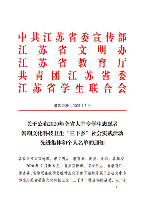 近日,中共江苏省委宣传部、江苏省文明办、江苏省教育厅、共青团江苏省委和江苏省学生联合会联合下发了《关于公布2020年全省大中专学生志愿者暑期文化科技卫生“三下乡”社会实践活动先进集体和个人名单的通知》,威尼斯官网在该活动中获多项荣誉:910023威尼斯团委荣获“先进单位”称号;“共筑长江梦,微笑正当时”实践团等7支团队荣获“优秀团队”称号;蔡志尚等8位同学荣获“先进个人”称号;卜江春等6位老师荣获“先进工作者”称号;溧阳市戴埠中心小学荣获“优秀社会实践基地”称号;《“喜迎建党一百周年”暑期社会实践活动》《扶贫先扶志,泗阳助梦行》荣获“优秀调研报告”称号。