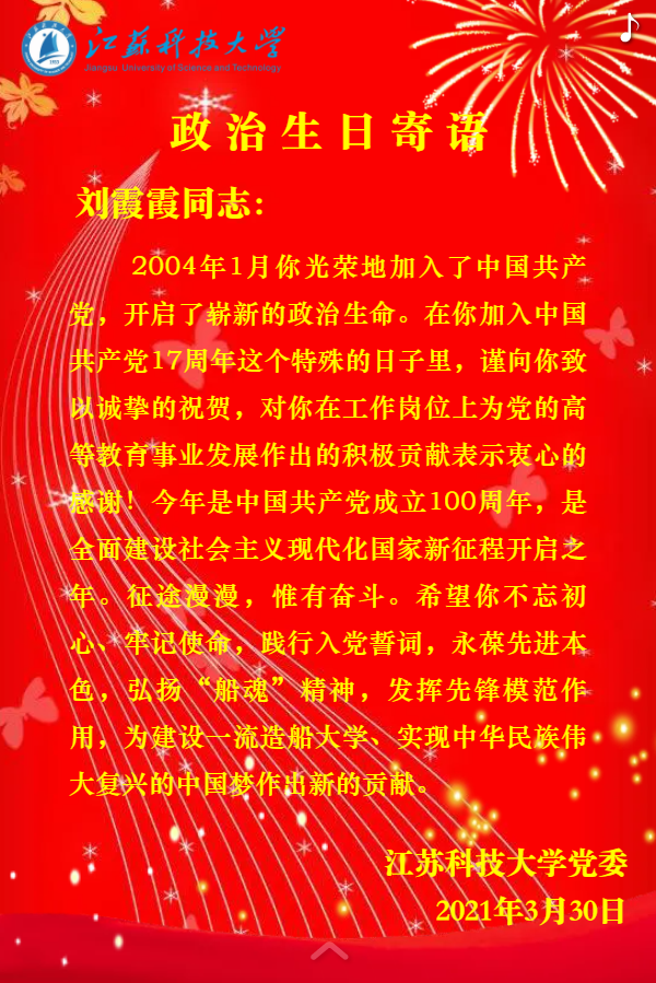 每名党员有两个生日,一个是自然生日,一个是政治生日;一个昭示着生命的开始,一个代表着在党的初心。为了引导党员同志不忘自己的“第一身份”,发挥先锋模范作用,910023威尼斯在全面启动党史学习教育的同时,梳理健全了4000多名党员政治生日台账,准确掌握每名党员的政治生日信息,精心制作了“政治生日贺卡”。在内容上,入党誓词、学校党委的衷心祝福和殷切希望都被印制在这张特殊的生日贺卡上;在形式上,融入校歌音乐、中国共产党党员成立100周年标识、不忘初心、牢记使命等元素;在接收方式上,支持电脑、手机、微信、QQ接收。从2021年3月开始,每月定时向党员推送政治生日贺卡,其中12月份将有1100多名党员同志过政治生日。