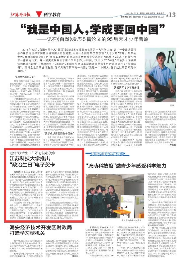 http://www.jskjb.com/xpaper/news/72196/76628/81601-1.shtml 江苏科技报 2021-04-07