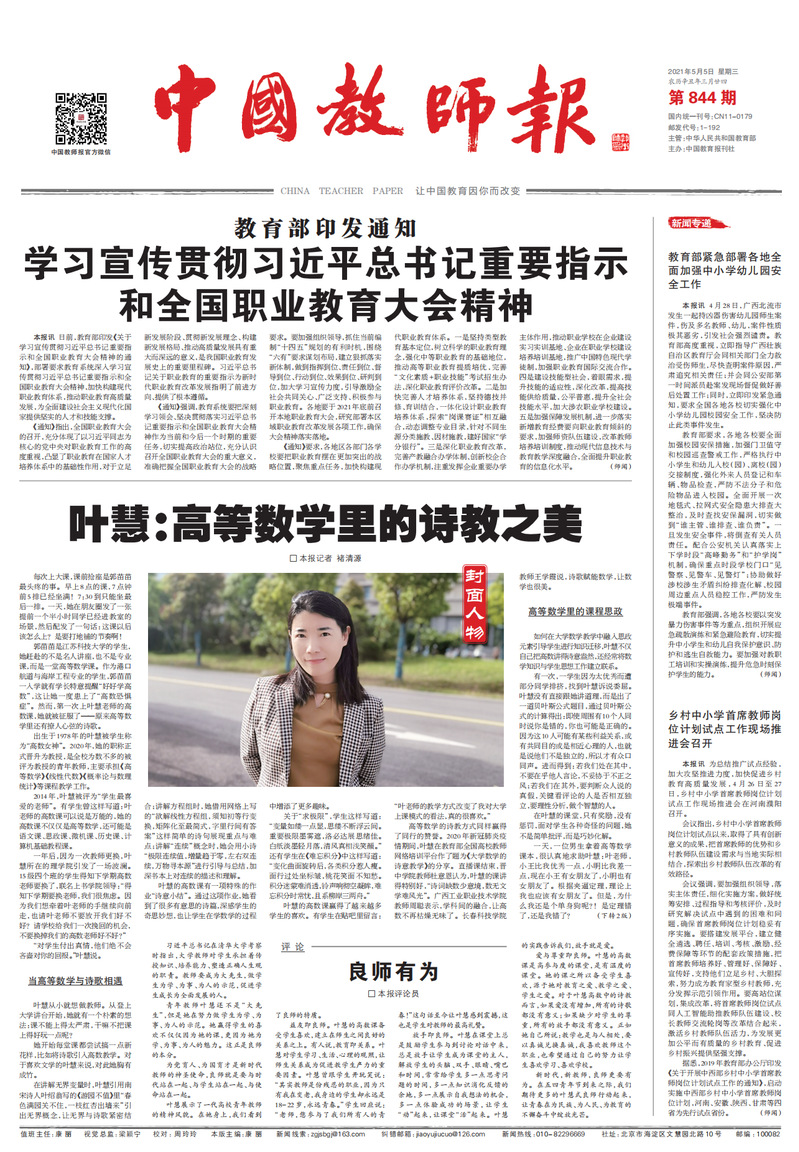 5月5日,《中国教师报》在头版“封面人物”栏目刊发专题报道,以《叶慧:高等数学里的诗教之美》为题,推介威尼斯官网叶慧教授结合自身教学经验与实践积累,结合当代大学生学习特点,积极策划、灵活安排,开展大学数学课程思政教学,赋予数学基础课程诗与灵性的做法,同时配发评论员文章《良师有为》。