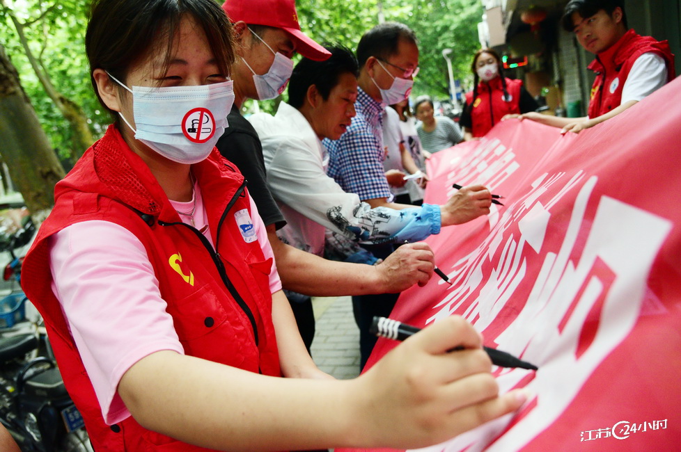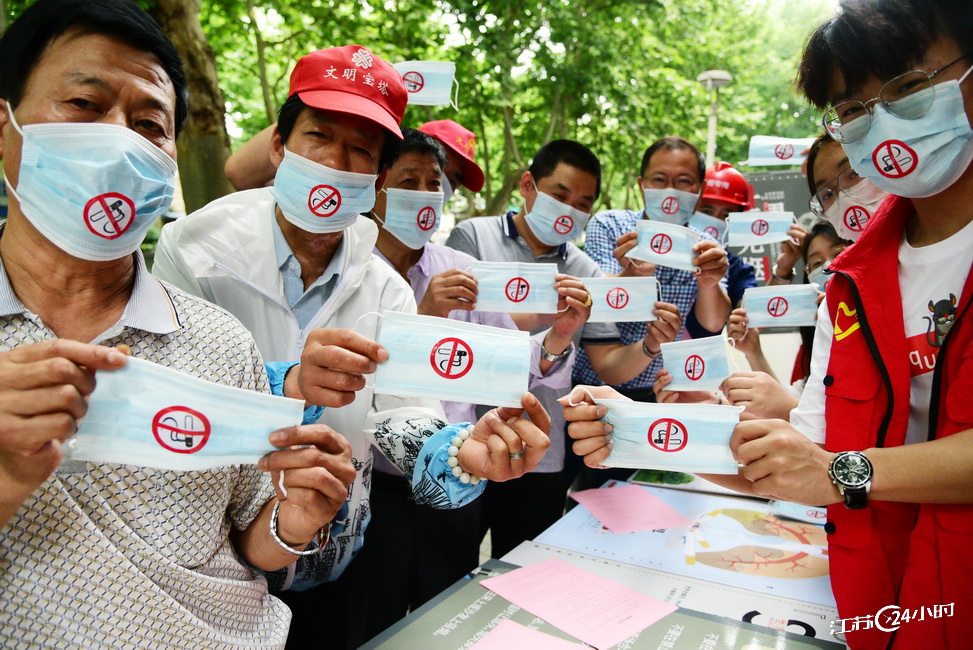 5月31日是世界无烟日,大学生志愿者来到镇江市宝塔路街道同德里社区开展“劝君戒烟 健康相伴”活动,通过制作禁烟标识口罩、宣传展板、在横幅上签名等形式,劝导烟民主动戒烟。