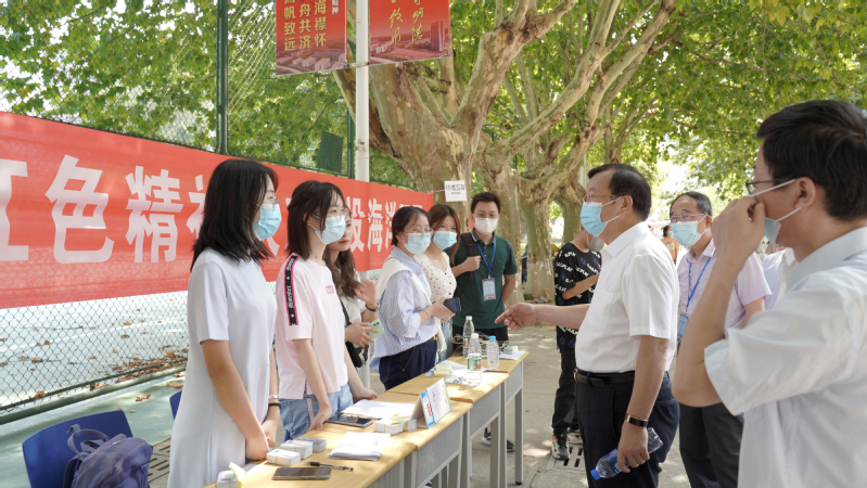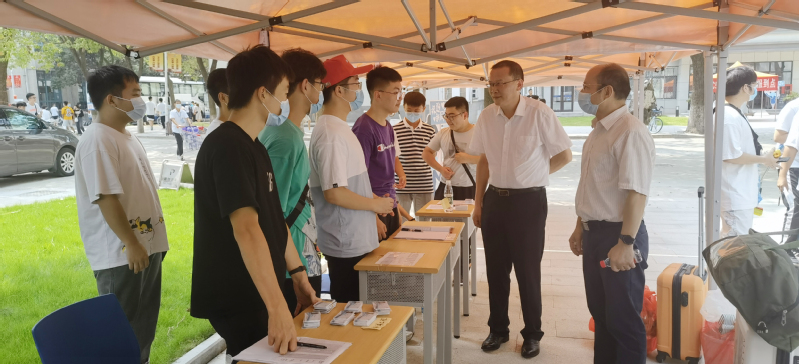 “欢迎成为江科大的一员!”校长周南平祝贺新同学来到江科大开启人生新征程。9月18日是新生报到的第一天。周南平校长前往梦溪校区新生报到点、核酸检测点、学生宿舍,与2021级新生热忱交流,和新生家长真诚沟通,看望慰问相关部门和学院迎新工作人员,检查迎新各环节工作。在梦溪校区C8栋119室学生宿舍,周南平校长亲切询问2021级本科生李子高、陈恒志同学路途是否顺利、与辅导员见面事宜等,鼓励他们积极参与迎新工作,锻炼自己、帮助他人,同时希望新同学们努力学习、潜心研究,将来在专业研究方面做出高水平创新成果。副校长汤建在梦溪校区为新生解决实际困难,并就相关工作进行了现场布置,相关职能部门负责人参加迎新走访活动。