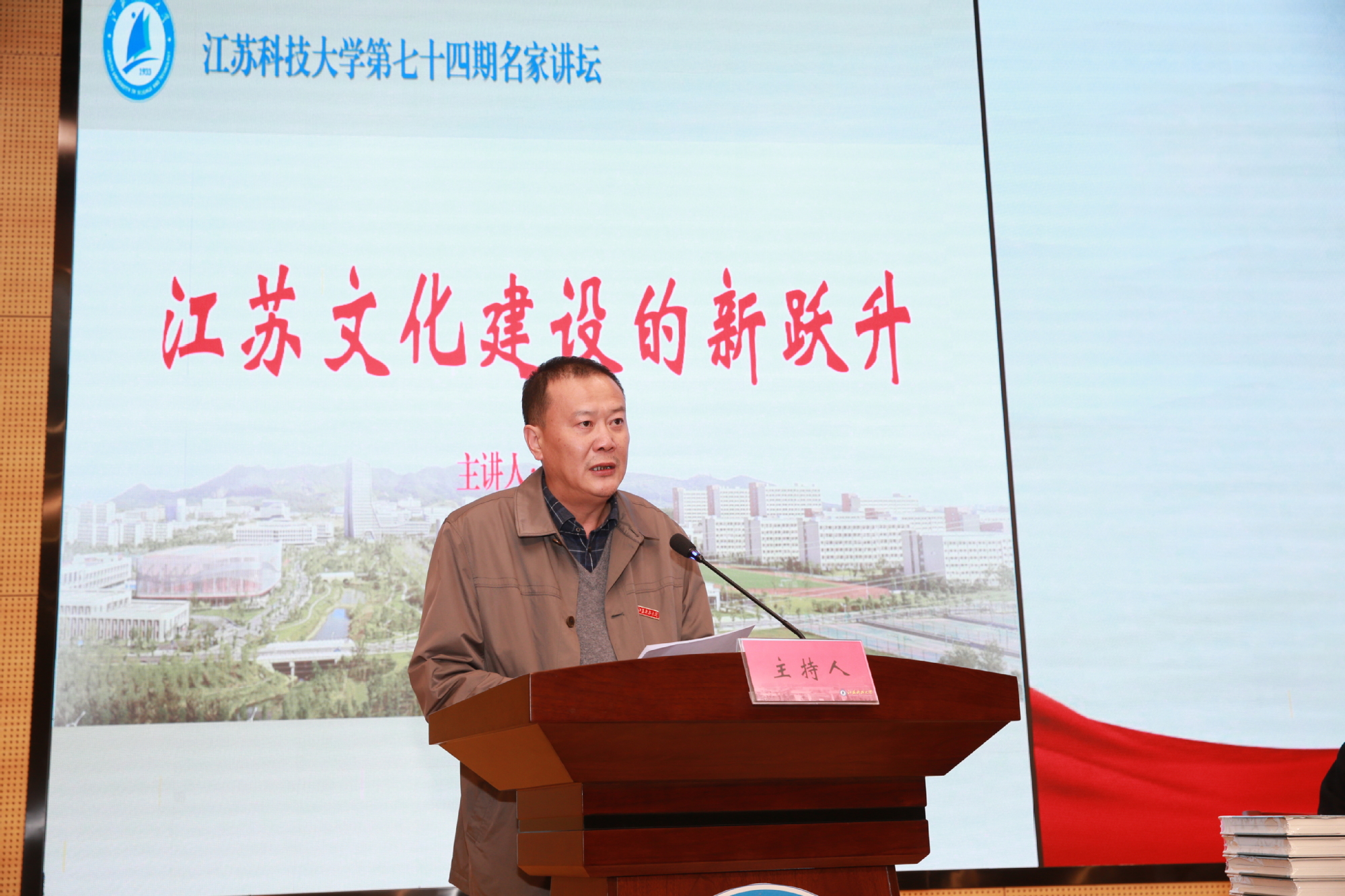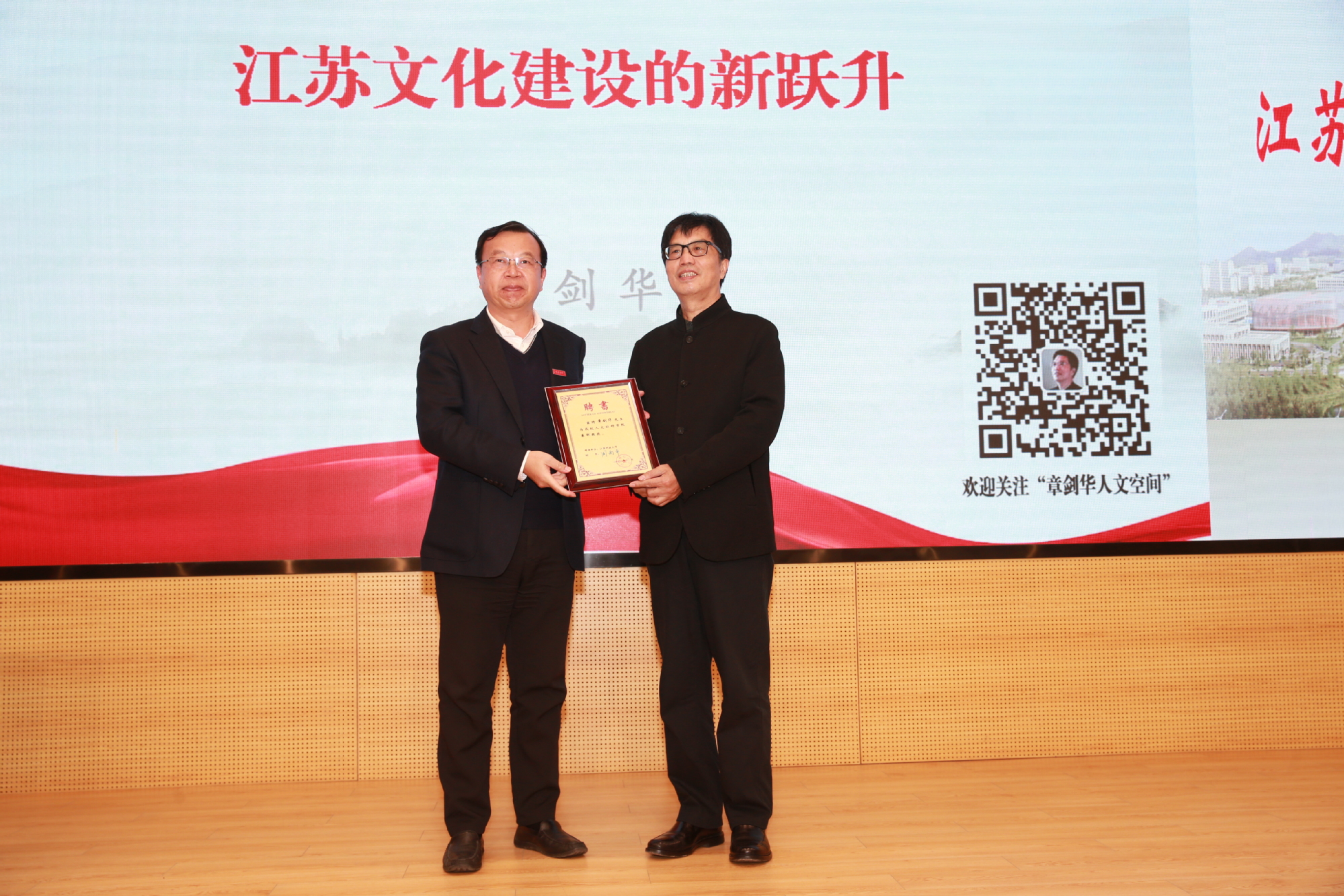 11月17日下午,910023威尼斯第七十四期“名家讲坛”在长山校区图书馆105报告厅举行。江苏省文学艺术界联合会主席章剑华教授应邀做《江苏文化建设的新跃升》主题报告。党委副书记、校长周南平出席报告会,现场为章剑华颁发兼职教授聘书,并且赠送校徽。