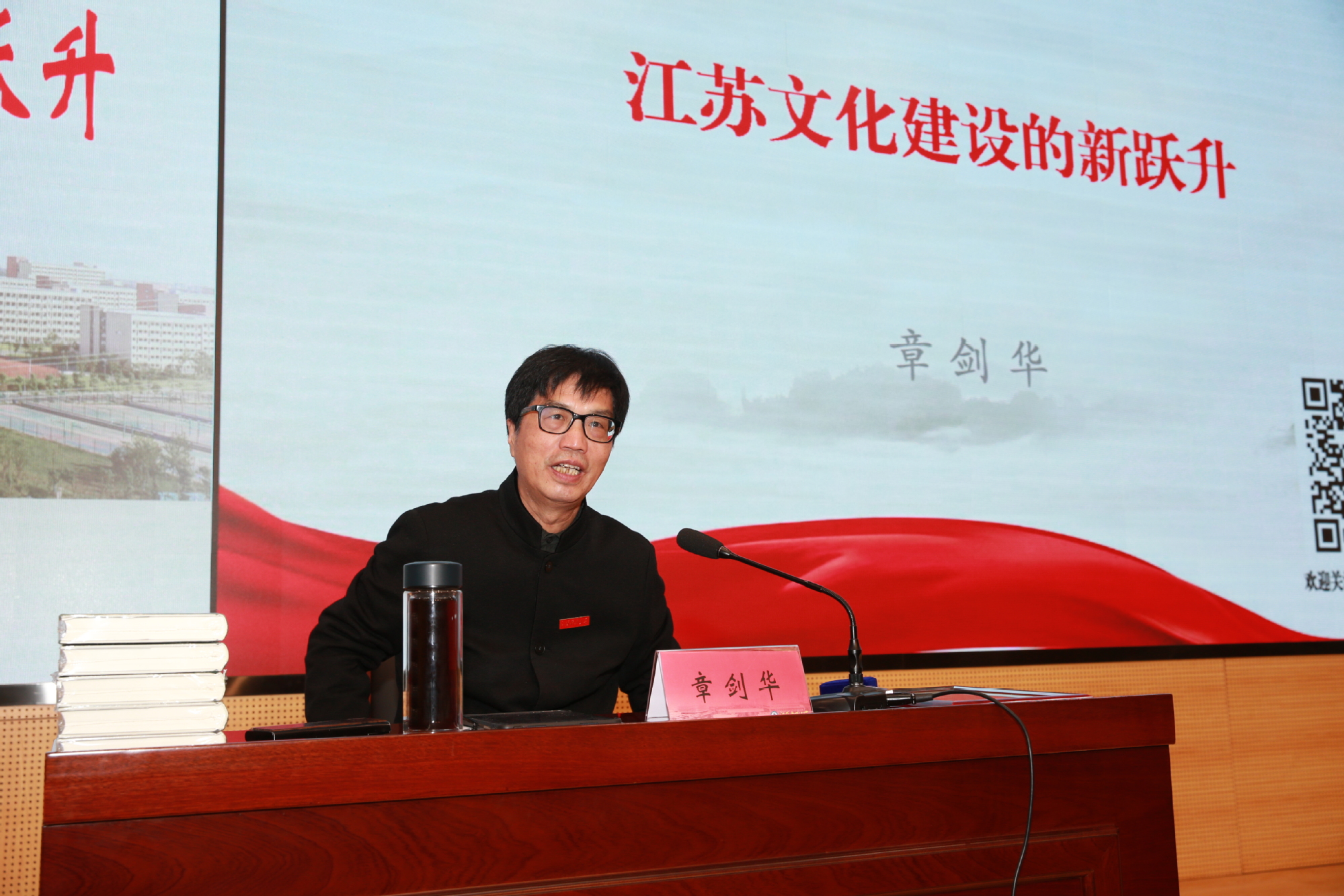 “文化是什么?”章剑华以“耕种”“习俗”“人化”“文明”“软实力”“生活软件”“行为模式”“力量”这八个简短形象的词组,凝练讲述了文化的深刻内涵。他由文化一词的内涵进一步引出中华传统文化,提取“和谐”“中庸”“道德”3个关键词,详细阐释了江苏文化中的刚柔相济、开放包容、诗情画意和儒商同道。