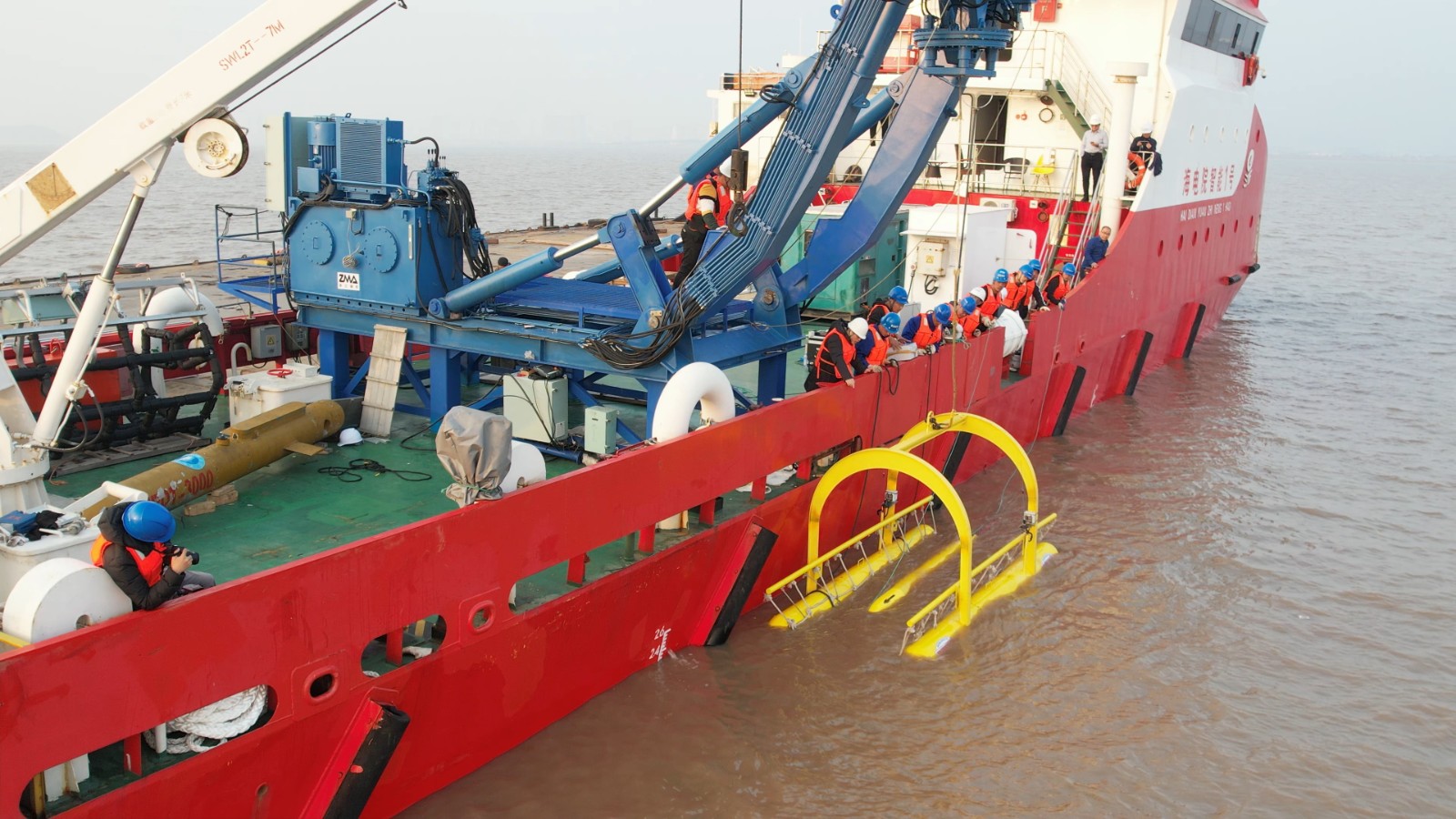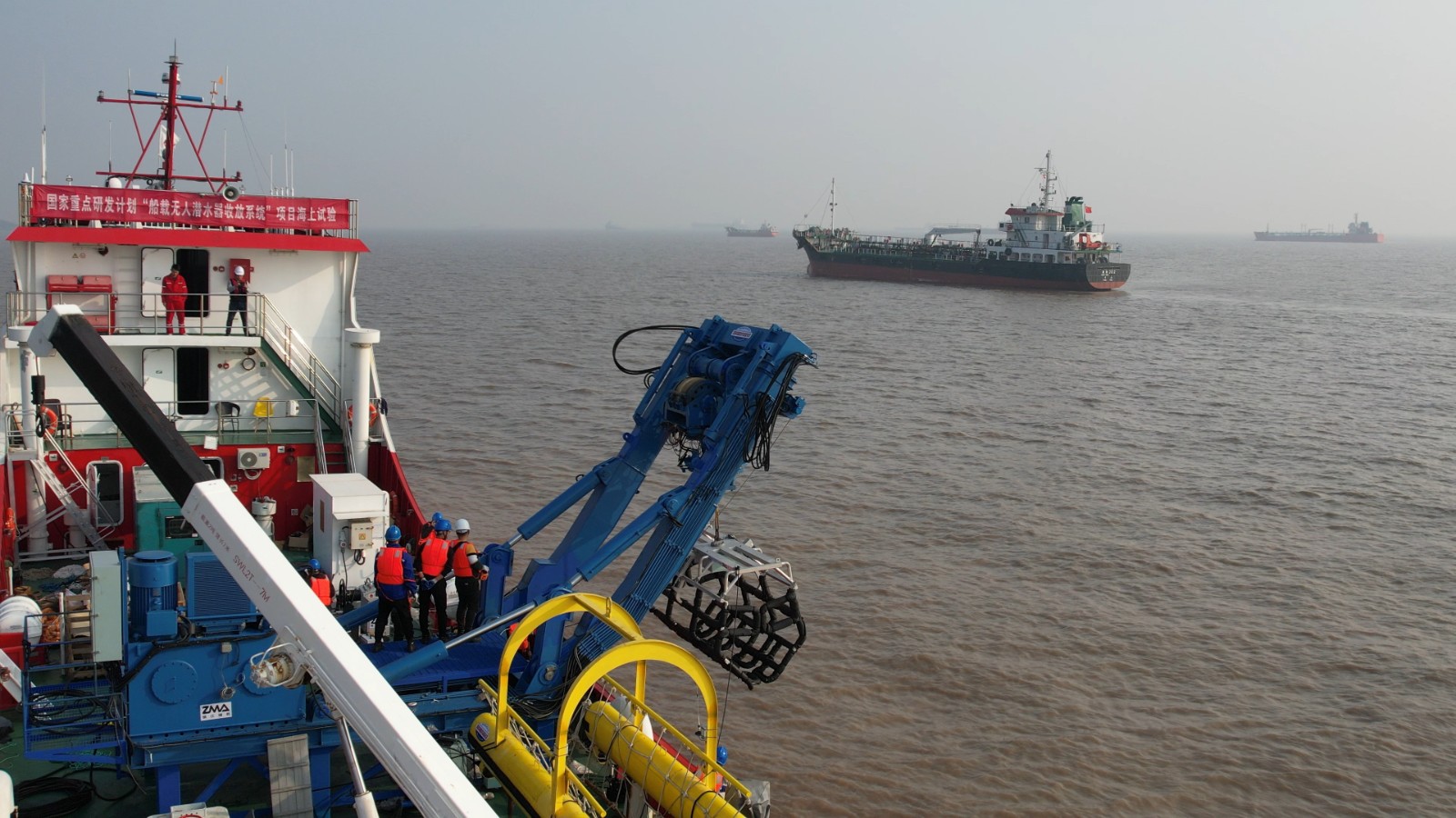 “船载无人潜水器收放系统”项目重点研发了船载多自由度主动波浪补偿门架吊放装置、遥操作水下机械手、带动力水中主动收放装置、抓取式收放笼等多种新型装备,这些新型装置及其联合收放方式为业界内首次创新与尝试,可实现对海中各种无人潜水器装置的高效收放,解决了在恶劣海况下无法回收的难题。本次海上试验对其上述装置进行了在舟山复杂多变海流情况下的布放与回收试验,分别对自治式潜水器(AUV)、遥控式潜水器(ROV)、水下滑翔机(AUG)、自治遥控混合式潜水器(ARV)等四种无人潜水器,实施布放与回收,系统工作正常、过程可控。经海试专家测评与打分,以97.08分的优异成绩通过了本次海上试验验收。