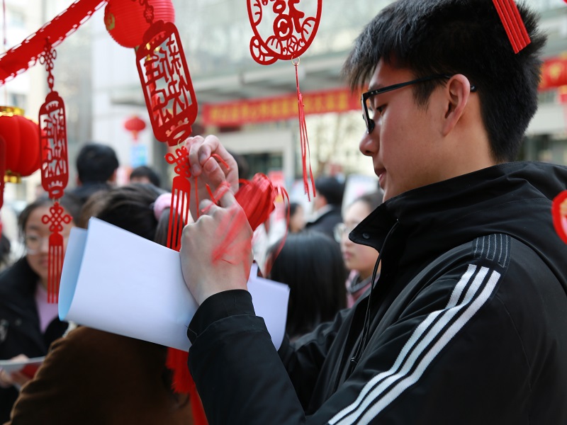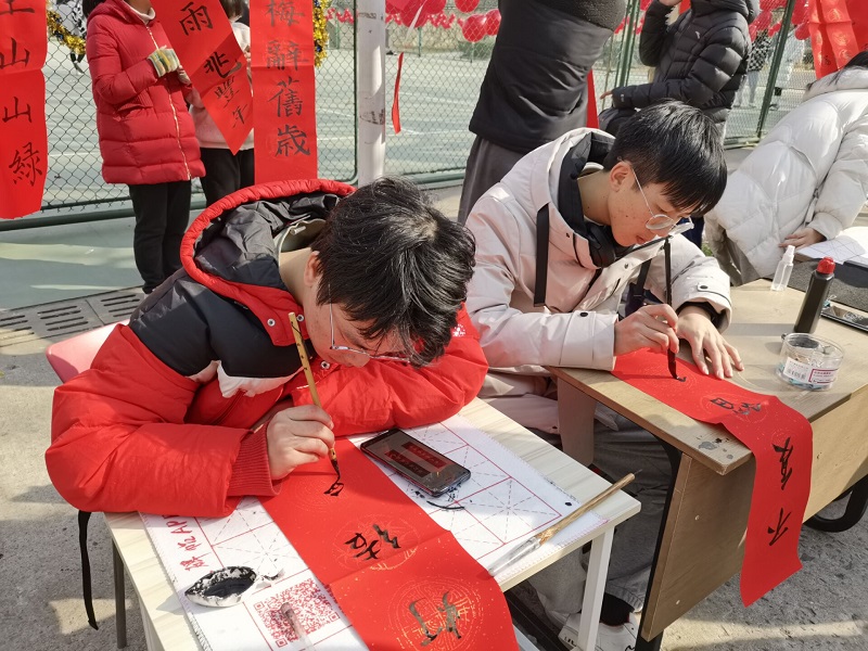“千门万户曈曈日,总把新桃换旧符”,迎新年怎能少得了对联?同学们纷纷抄起看家本领写对联送福字,一个个大显身手,用飘逸灵动的毛笔字、喜气洋洋的祝福语,迎接新年的到来。校园宣传栏下,灯笼早早挂起,象征着新的一年红红火火,灯笼之下,同学们争相开动脑筋,猜着灯谜,感受浓浓的中国年味。