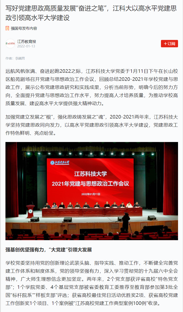 学校党委坚持用党的创新理论武装头脑、指导实践、推动工作,不断健全完善党建工作体系和制度体系,党的领导坚强有力,深入学习贯彻党的十九届六中全会精神,广大师生理想信念更加坚定。两年来,2个党支部获评省高校“特色党支部”;1个学院党委、4个基层党支部被省委教育工委推荐至教育部参加第3批全国“标杆院系”“样板支部”评选;获省高校最佳党日活动优胜奖2项、获省高校党建工作创新奖1个项目、1个案例被“江苏高校党建工作典型案例100例”收录。