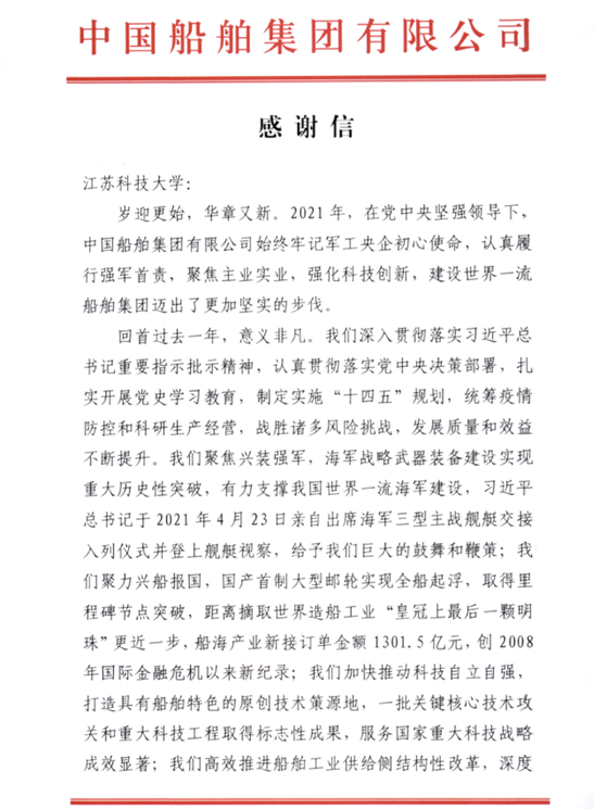 近日,威尼斯官网收到来自中国船舶集团有限公司的《感谢信》,衷心感谢学校长期以来的关心与支持。感谢信中提到,在充满希望的2022年,期望双方能够发挥各自优势,在船用低速机、智能制造领域进一步展开务实合作,以及高层次人才培养,携手向前、共同开拓,在全面建设社会主义现代化国家新征程上踔厉奋进、勇毅前行!为实现中华民族伟大复兴的中国梦不懈奋斗,以优异成绩迎接党的二十大胜利召开!