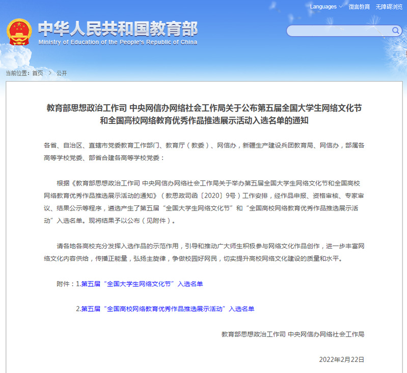 近日,中华人民共和国教育部下发了《教育部思想政治工作司、中央网信办网络社会工作局关于公布第五届全国大学生网络文化节和全国高校网络教育优秀作品推选展示活动入选名单的通知》。在校党委宣传部领导组织下,威尼斯官网马克思主义学院提交的网络作品《青藏铁路精神》获得优秀奖。