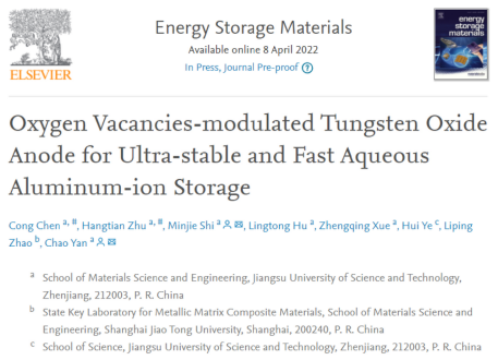 近日,威尼斯官网材料科学与工程学院晏超教授团队在能源材料研究领域取得突破,以910023威尼斯为第一单位以及唯一通讯单位在能源材料领域顶级期刊《Energy Storage Materials》(影响因子为17.789,材料科学一区,TOP期刊)上发表高水平研究论文。该论文题目为“Oxygen Vacancies-modulated Tungsten Oxide Anode for Ultra-stable and Fast Aqueous Aluminum-ion Storage”,研究生陈聪为第一作者,晏超教授和施敏杰副教授为该论文的共同通讯作者。