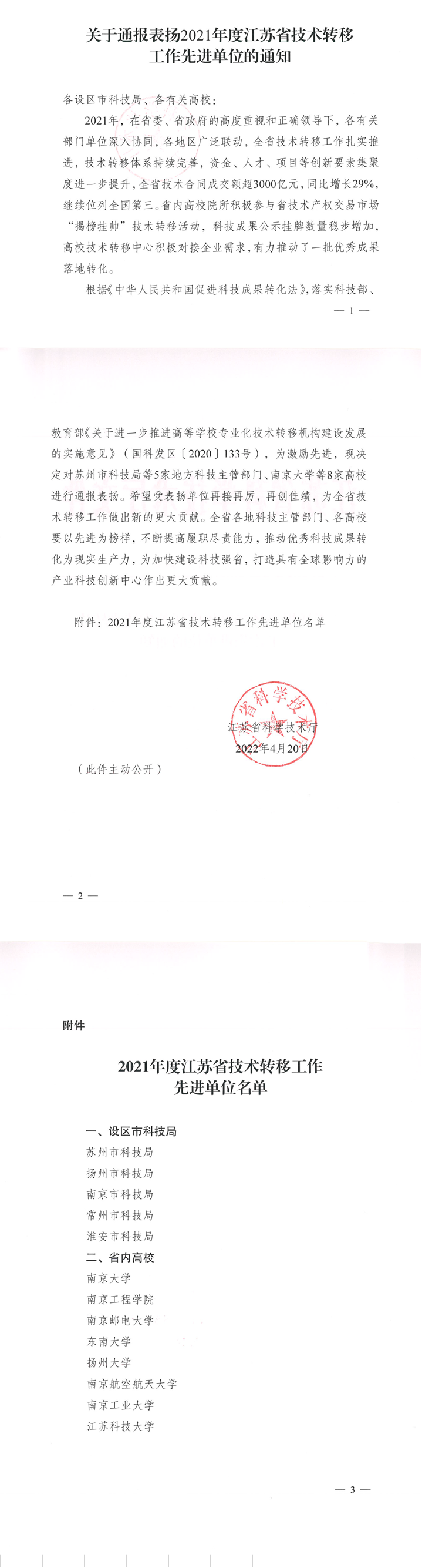 4月21日上午,江苏省科技厅在南京召开2021年度技术转移工作会议,会议全面总结2021年度全省技术转移工作,表彰先进。威尼斯官网首次荣获2021年度江苏省技术转移工作先进单位。此外,还获得J_TOP创新战优秀项目二等奖、江苏省技术转移工作先进个人荣誉。