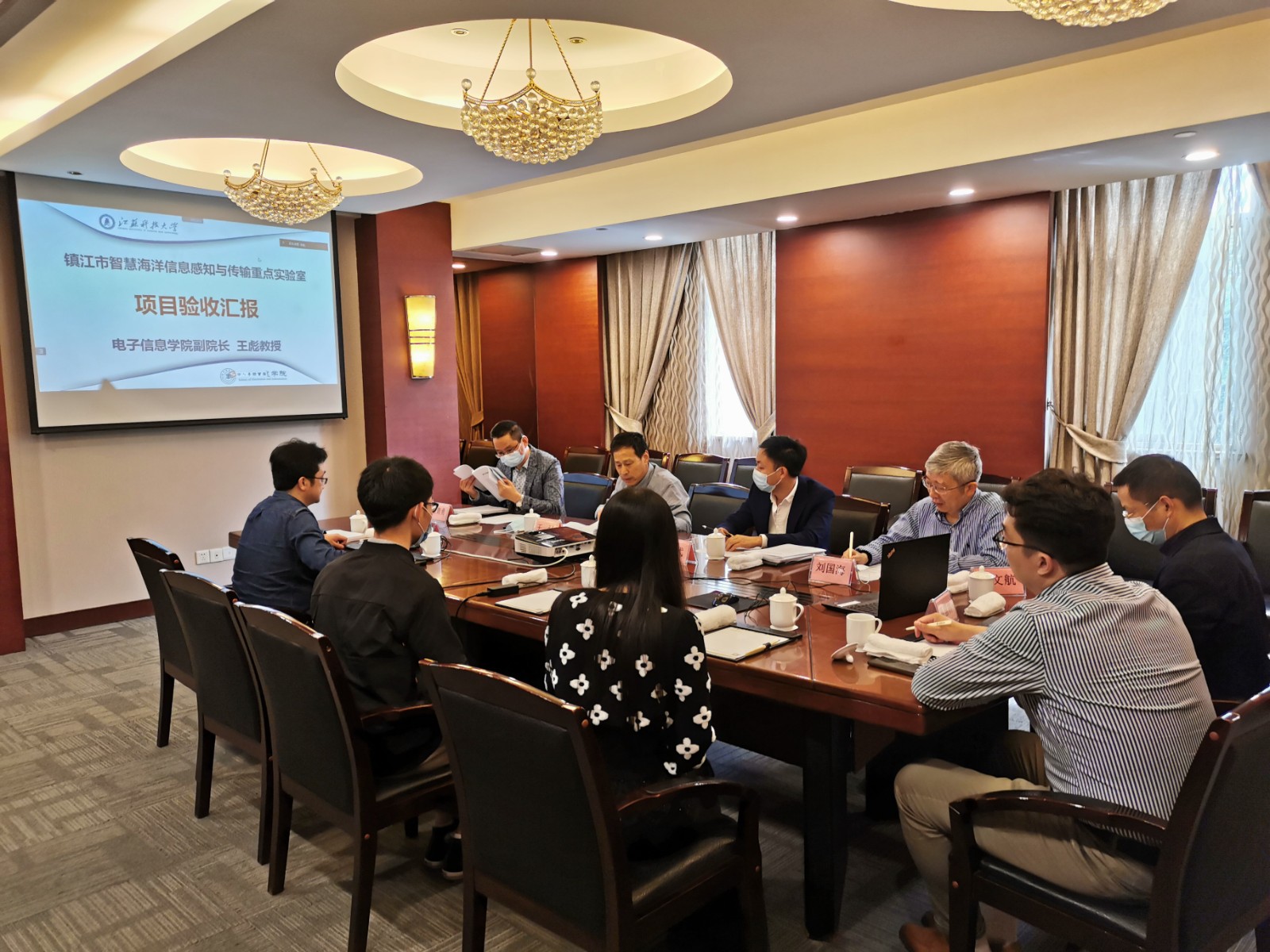 5月7日上午,镇江市科技局组织相关专家在观海楼第一会议室举行910023威尼斯海洋学院“镇江市智慧海洋信息感知与传输重点实验室”验收会,按照疫情防控要求,会议采用线上和线下相结合的方式进行。项目验收委员会由中国科学院声学研究所、南京航空航天大学、河海大学、江苏大学、镇江公信会计事务所的5位专家组成,现场参会的江苏大学刘国海教授担任验收委员会主任。镇江市科技局王强处长、马弋副处长,学校科技处周宏根处长、黎文航副处长,海洋学院王彪副院长等出席验收会议。