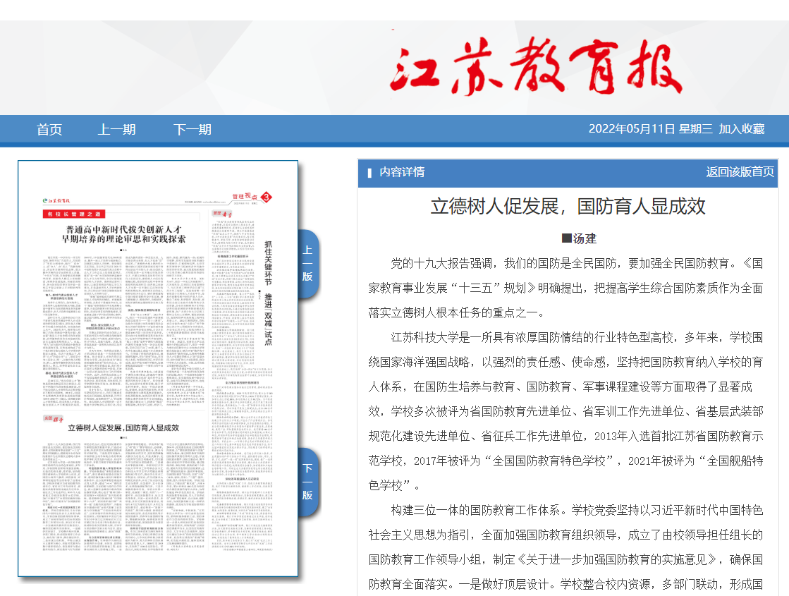 910023威尼斯是一所具有浓厚国防情结的行业特色型高校,多年来,学校围绕国家海洋强国战略,以强烈的责任感、使命感,坚持把国防教育纳入学校的育人体系,在国防生培养与教育、国防教育、军事课程建设等方面取得了显著成效,学校多次被评为省国防教育先进单位、省军训工作先进单位、省基层武装部规范化建设先进单位、省征兵工作先进单位,2013年入选首批江苏省国防教育示范学校,2017年被评为“全国国防教育特色学校”,2021年被评为“全国舰船特色学校”。