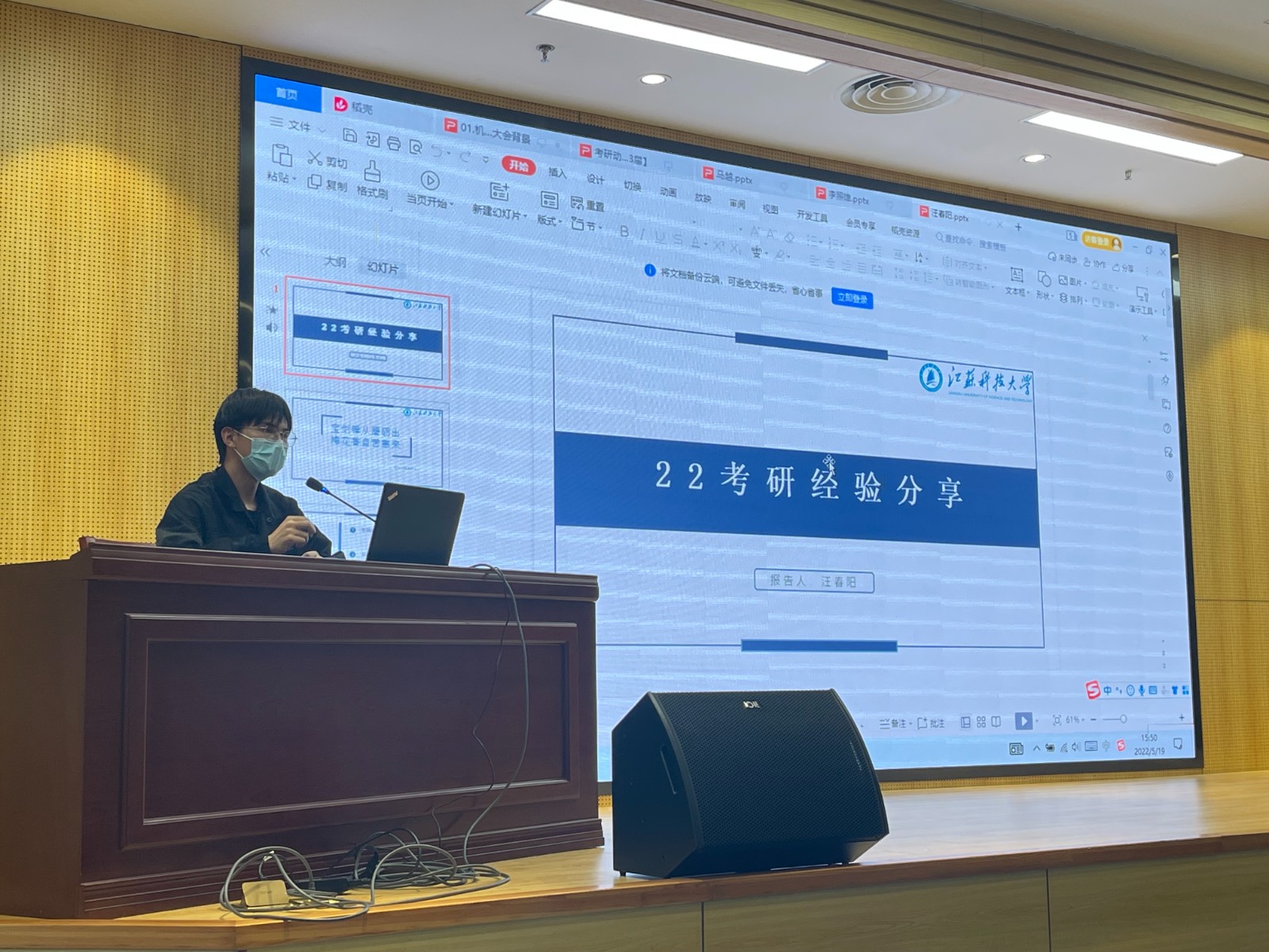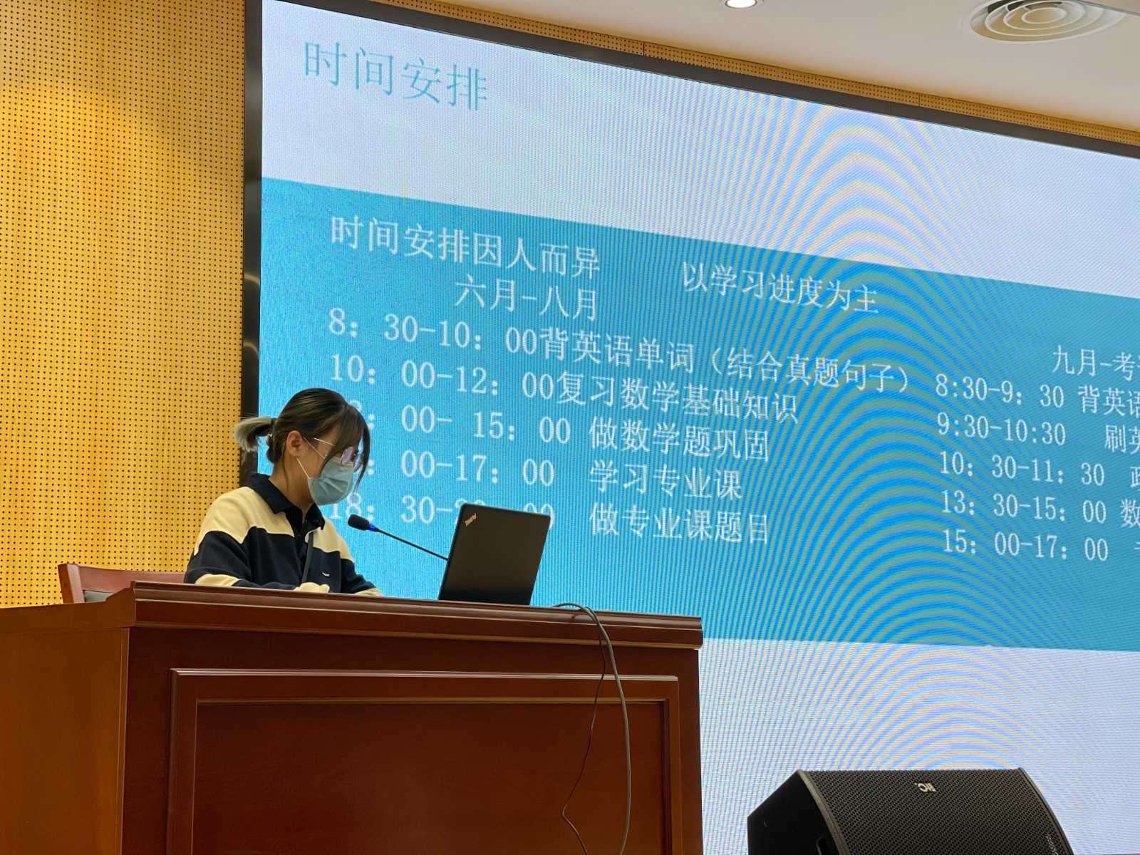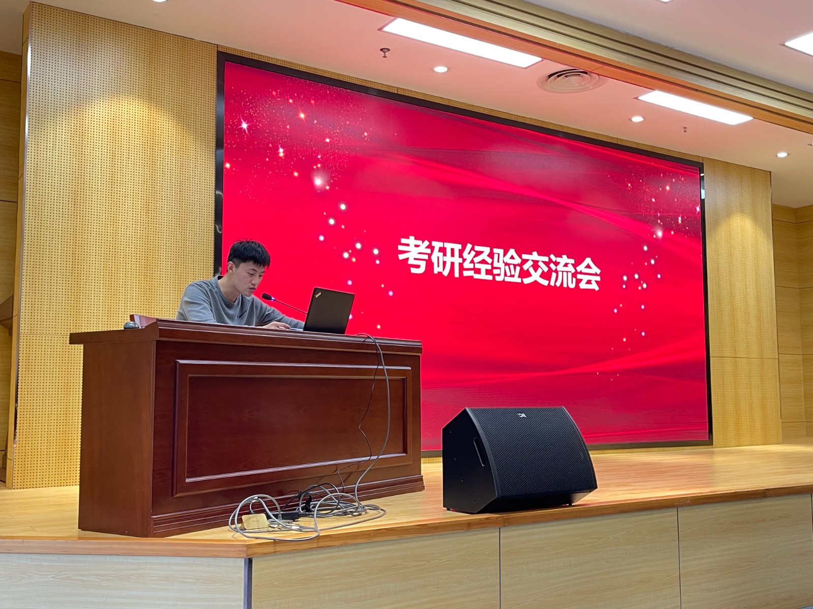 随后,学院邀请了6位2022届保研、考研成功的学长学姐做考研经验分享。王云涛同学主要介绍了自己“学生管理专项”保研的经历,向大家详细讲解该专项保研的具体要求,并分享自己在申报工作、资料准备等方面的经验。李照雄同学则从自己申请多所985高校保研资格方面进行经验分享,包括如何参加保研夏令营,保研面试技巧等等。张福增同学重点讲述自己在考研期间的心态变化,鼓励学弟学妹们一定要树立信心、坚定决心、守住恒心,只要认准目标便只顾风雨兼程。马越同学为学弟学妹详细介绍了自己的复习计划,包括目标确定、复习安排、参考资料等等。汪春阳同学针对想要报考本校的同学重点分享报考本校的优势和复习方法,包括专业课复习的技巧等。刘建华同学以自身为例,讲述自己考研路上披荆斩棘的逆袭之旅,鼓励大家通过自己的努力实现自身的华丽转身。