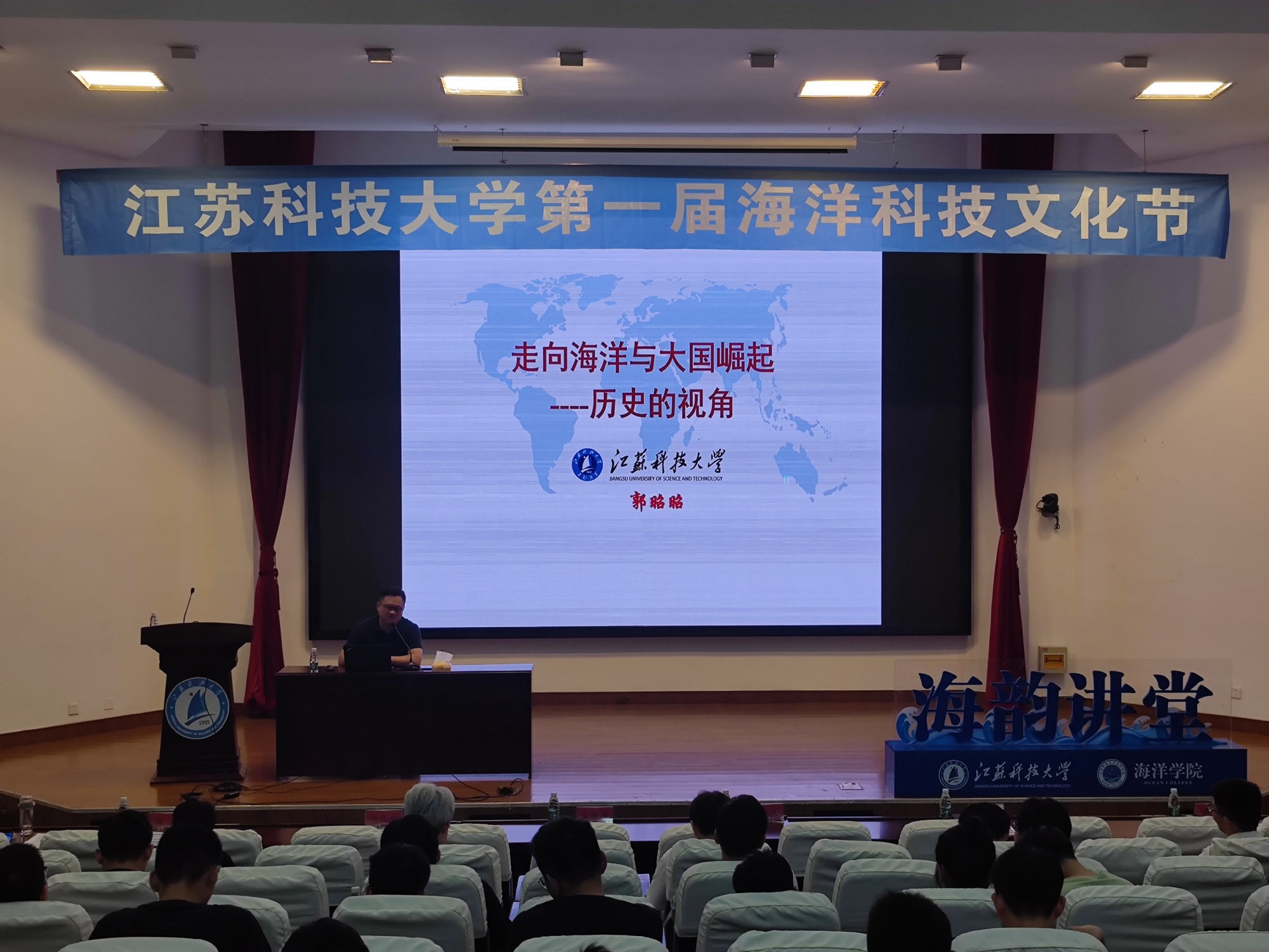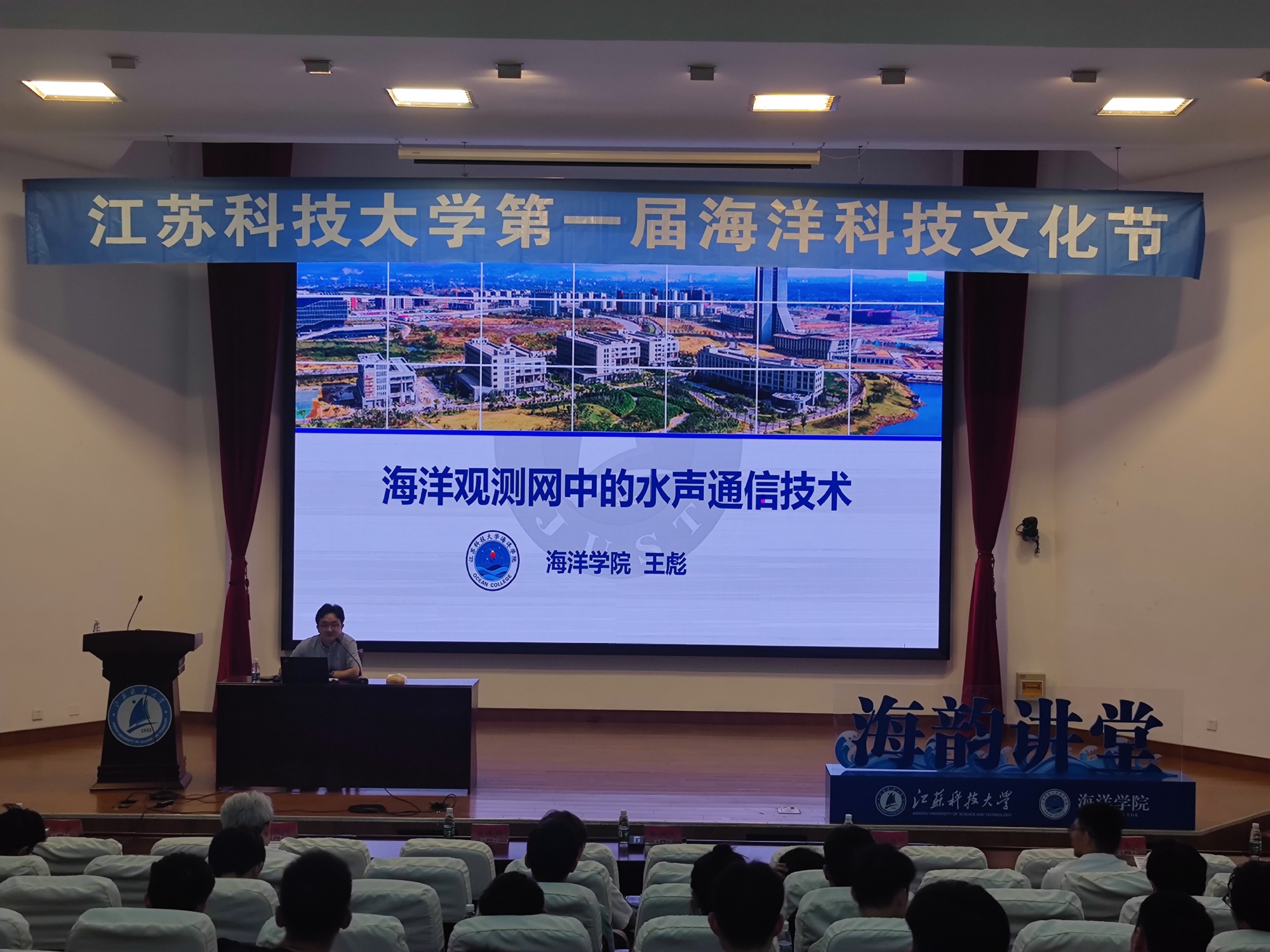 开幕式后,海韵讲堂正式开讲,海洋学院副院长王彪作了题为《海洋观测网中的水声通信技术》的专题报告,对海洋观测网络、水声通信发展、水声研究方向与成果进行了介绍;马克思主义学院党总支书记郭昭昭带来《走向海洋与大国崛起-历史的视角》的主题报告,对世界大国崛起的经验进行了总结分析。2位教授的报告深入浅出、生动精彩,受到与会师生的热烈欢迎,大家纷纷表示收获良多。海洋学院2018级水声工程专业谢雨珊表示:“作为一名海洋学子,要牢记使命担当,探海求真,博学笃行,在以后的学习、工作中聚焦海洋强国建设,通过科技报国的方式来为建设海洋强国贡献自身的一份力量。”2021级信息与通信工程专业研究生郭晓鹏表示:“构建海洋观测网络是实现海洋强国的必经之路,而水声通信技术又是海洋观测网络实现的关键技术,在今后的学习中要进一步提升专业本领与能力,以饱满的热情和昂扬的斗志,向海图强,逐梦深蓝!”