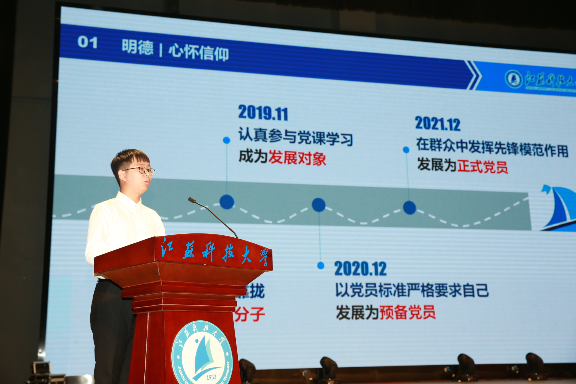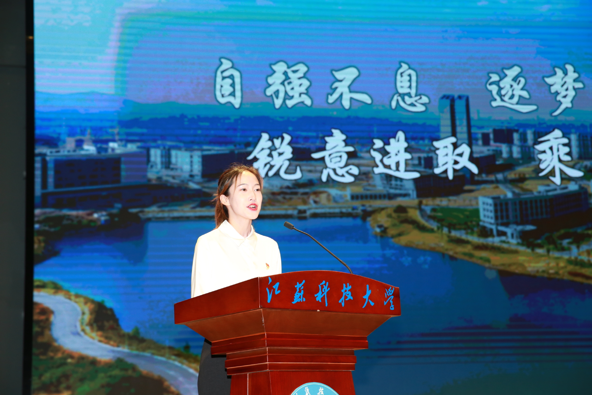 学习进取类获奖代表李霆峰、创新创业类获奖代表郑天泽、励志自强类获奖代表李媛媛依次进行风采展示,分别介绍了自己在学习科研、创新创业、自立自强等方面的突出成绩,展示了江科大青年学子昂扬的青春风貌。