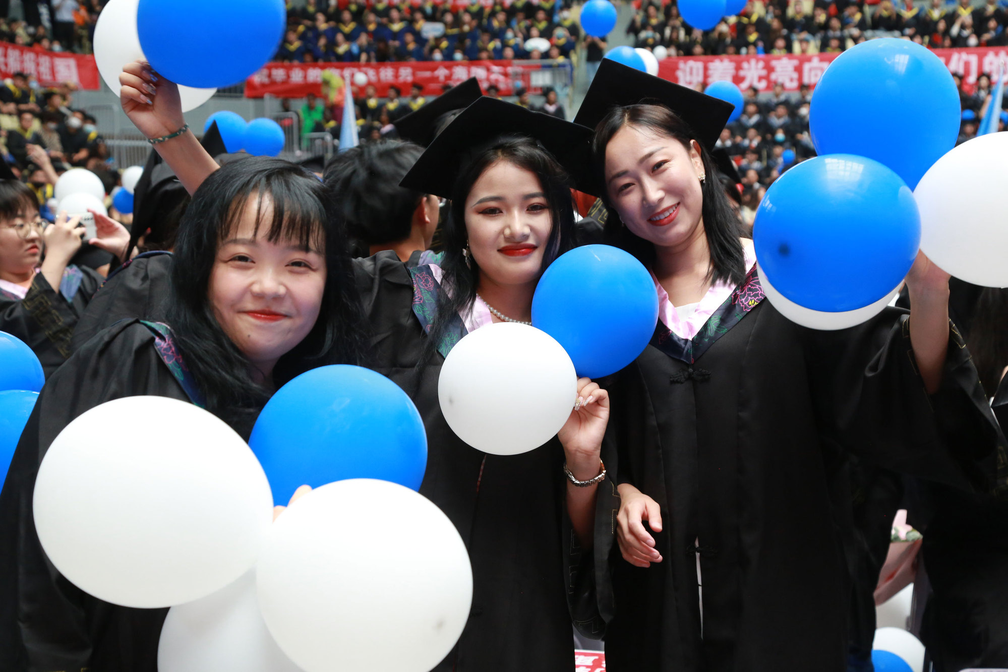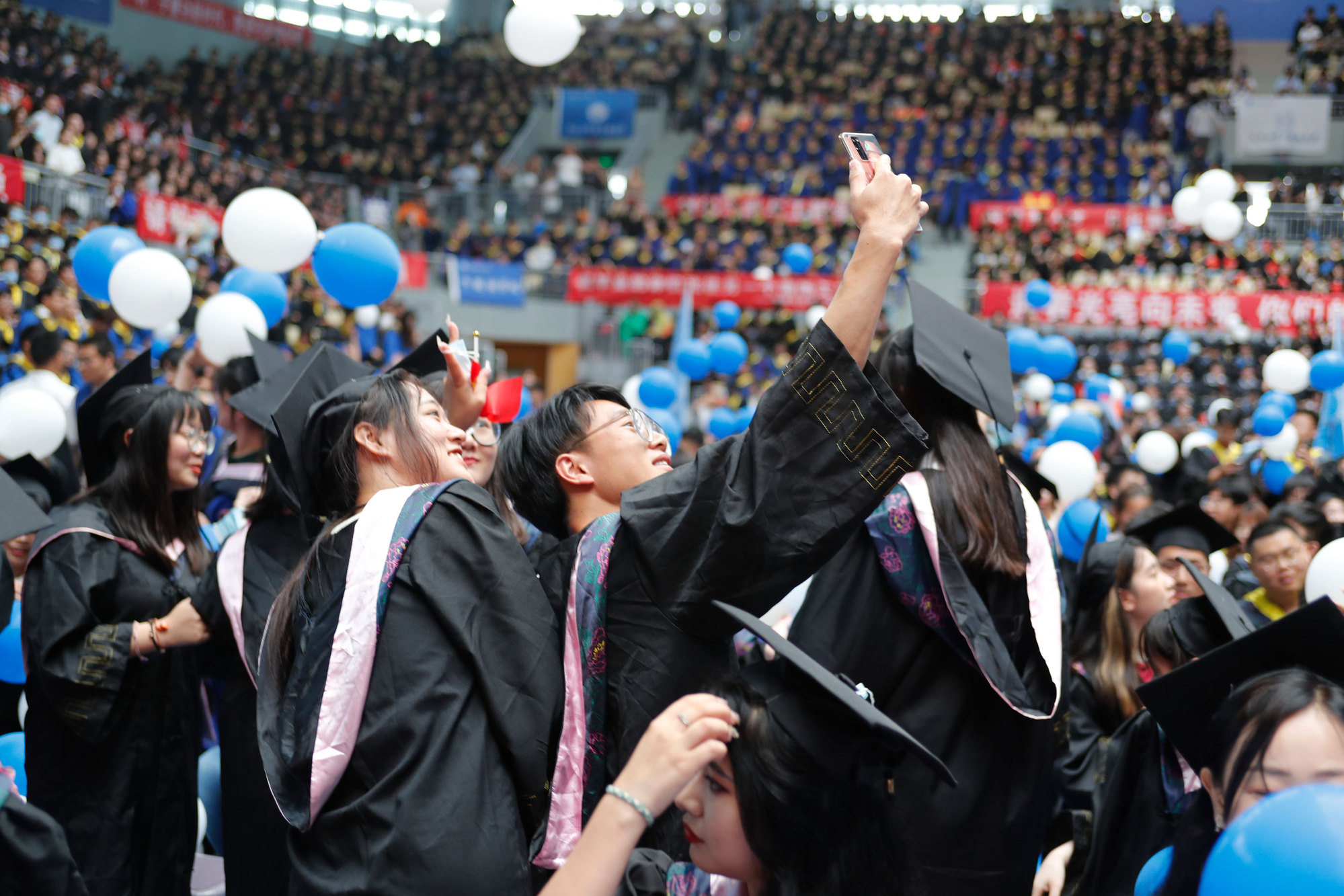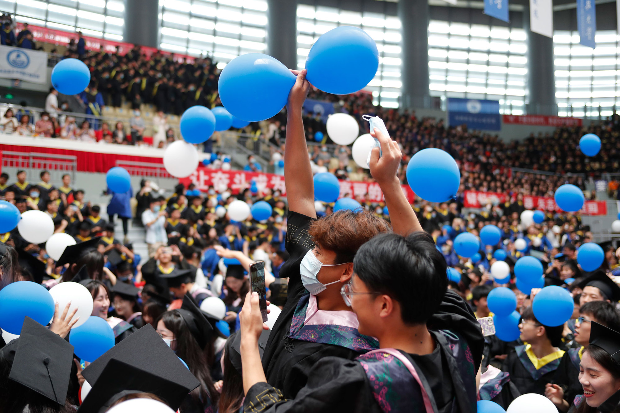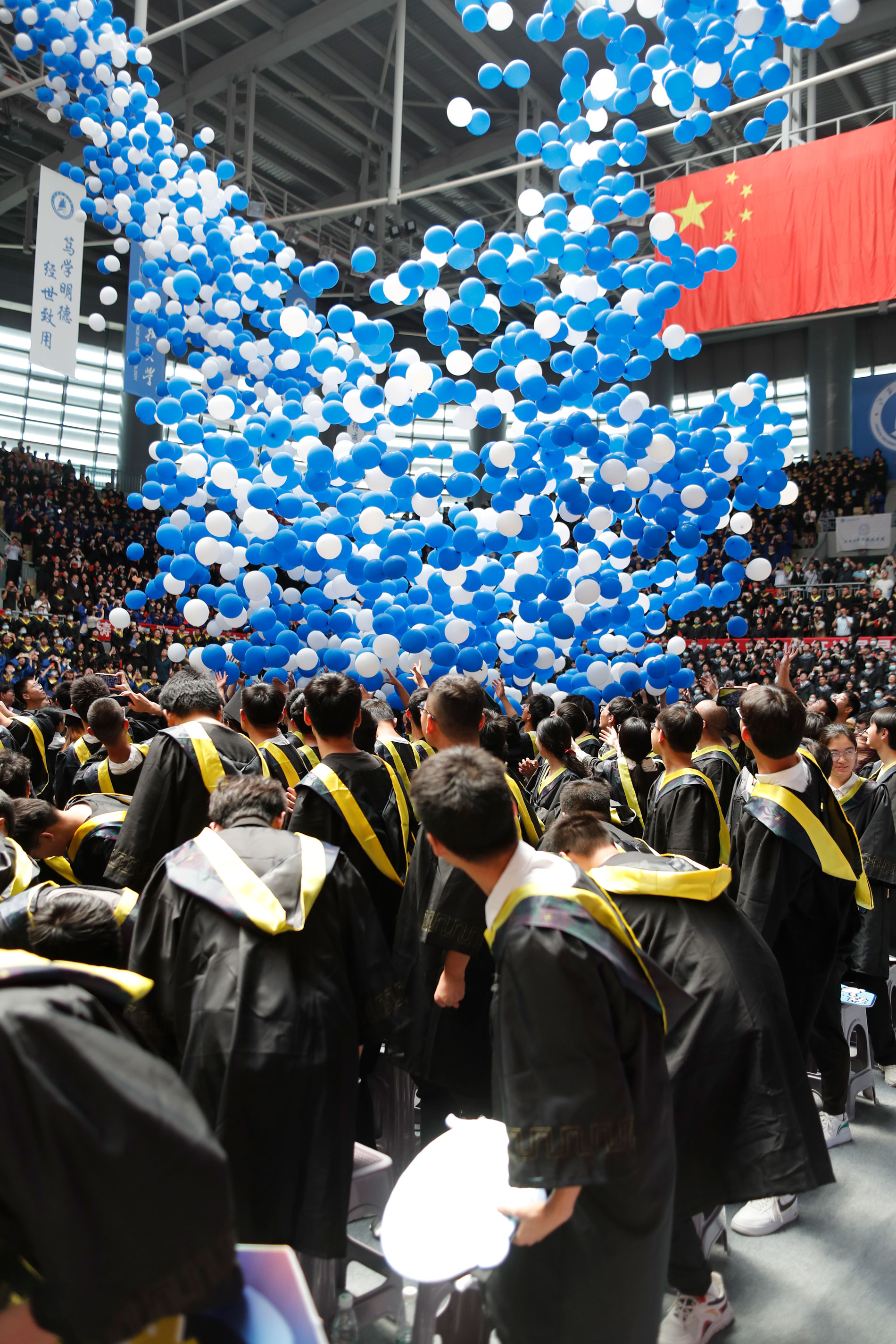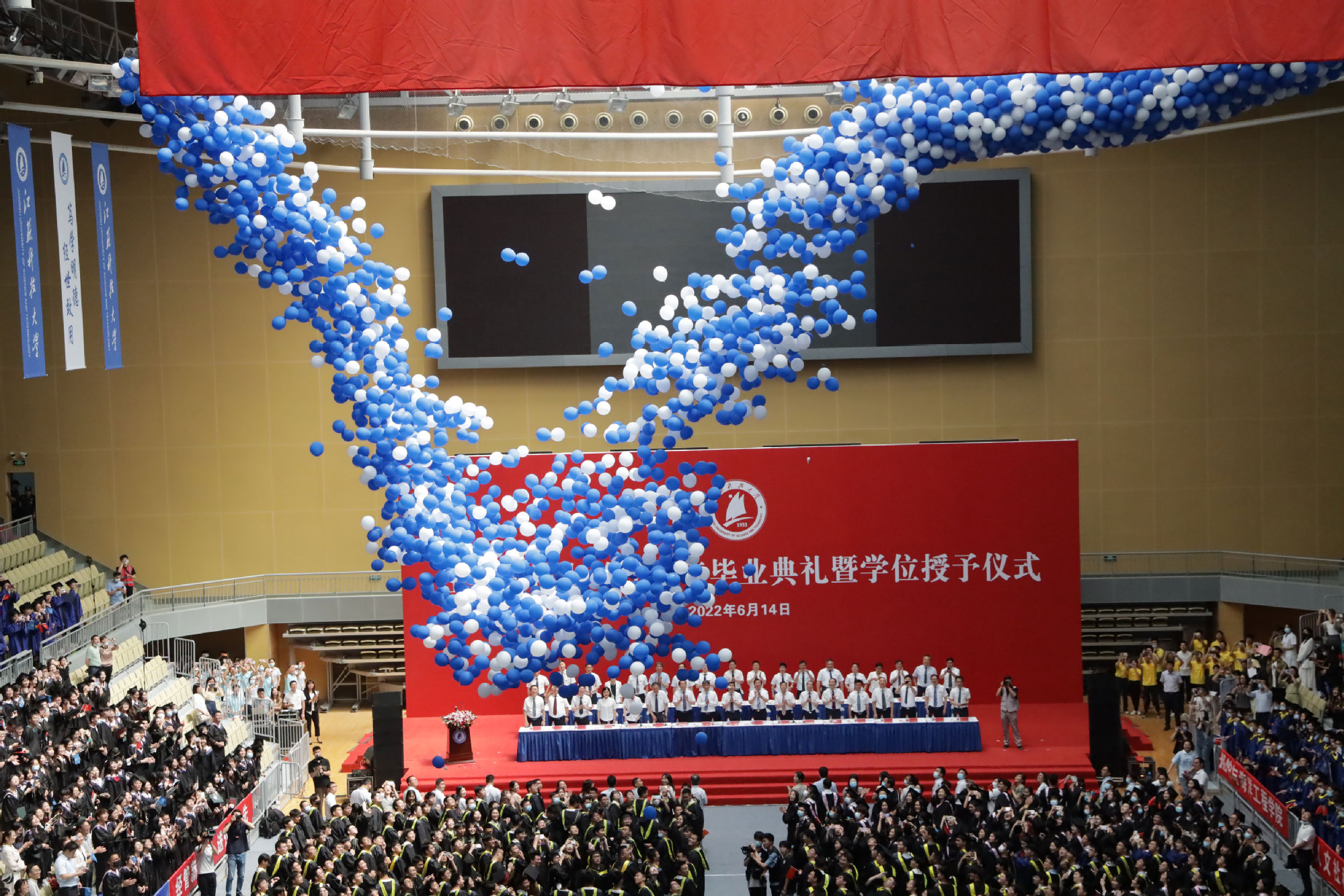 在910023威尼斯校歌声中,数千只蓝白相间的彩色气球从高空缓缓散落,仿佛跃腾的海浪,将现场氛围感拉满。伴着一路欢歌,庄重的学位授予仪式开始,毕业生依次上台领取学位证书,学位委员会全体导师为他们一一拨穗,圆满完成学位授予仪式。