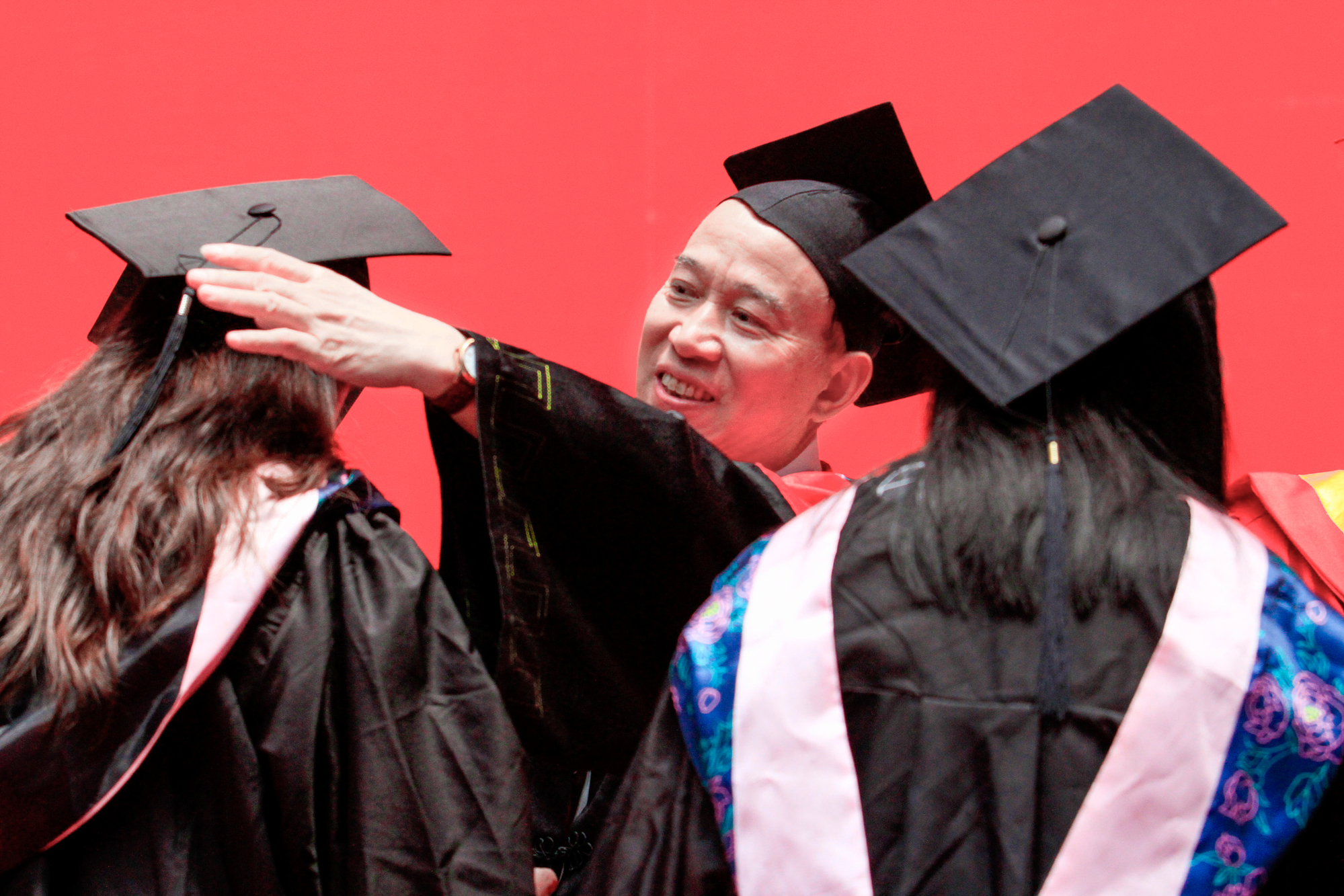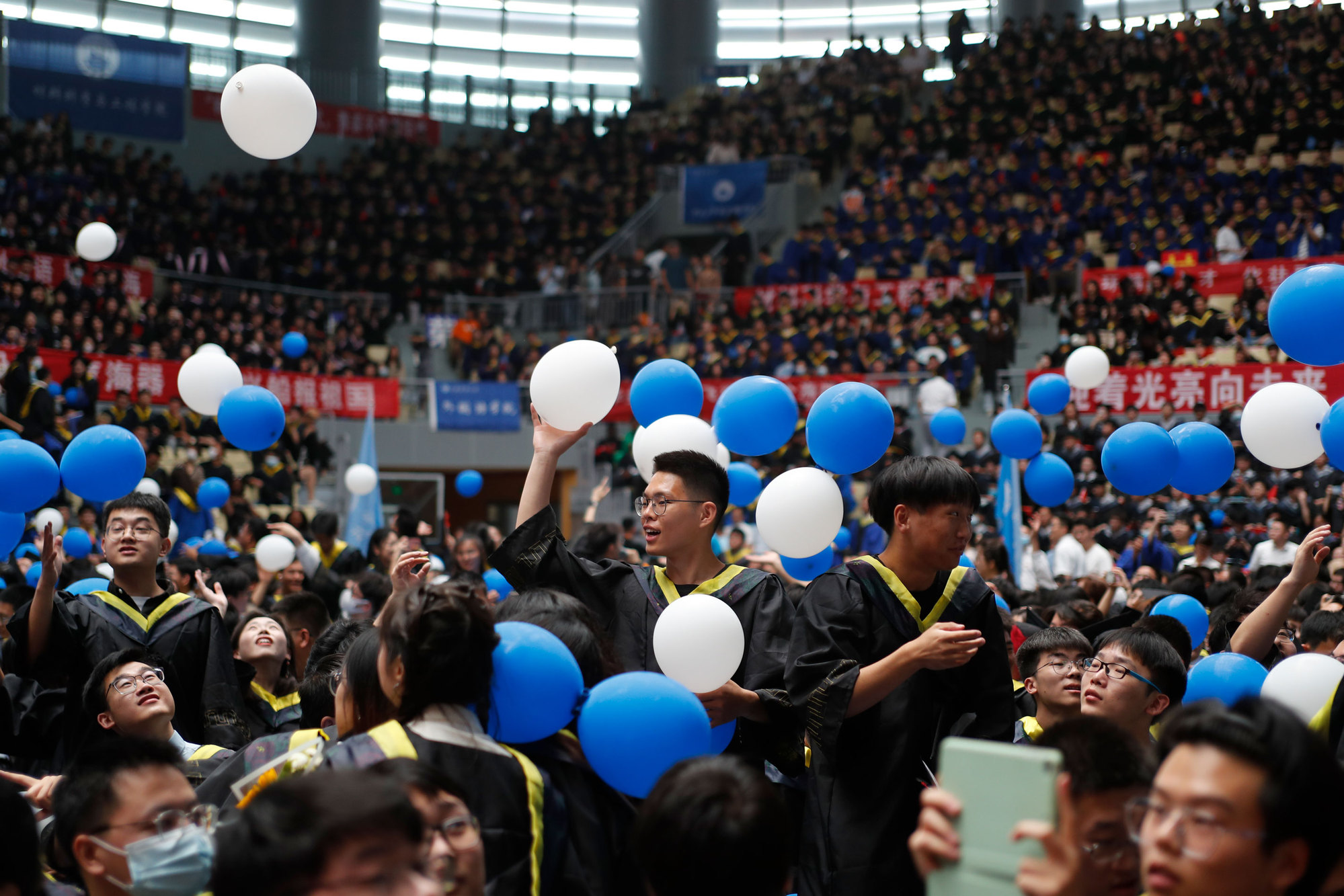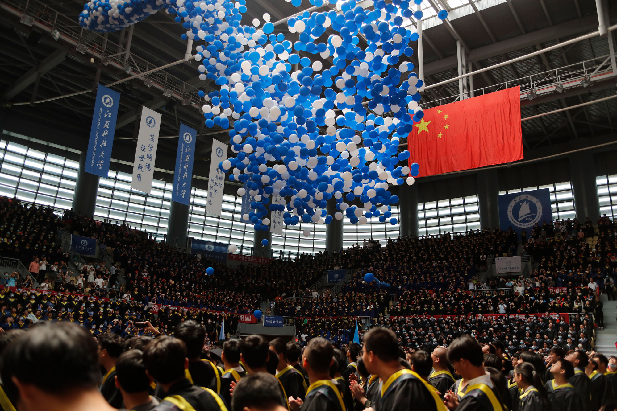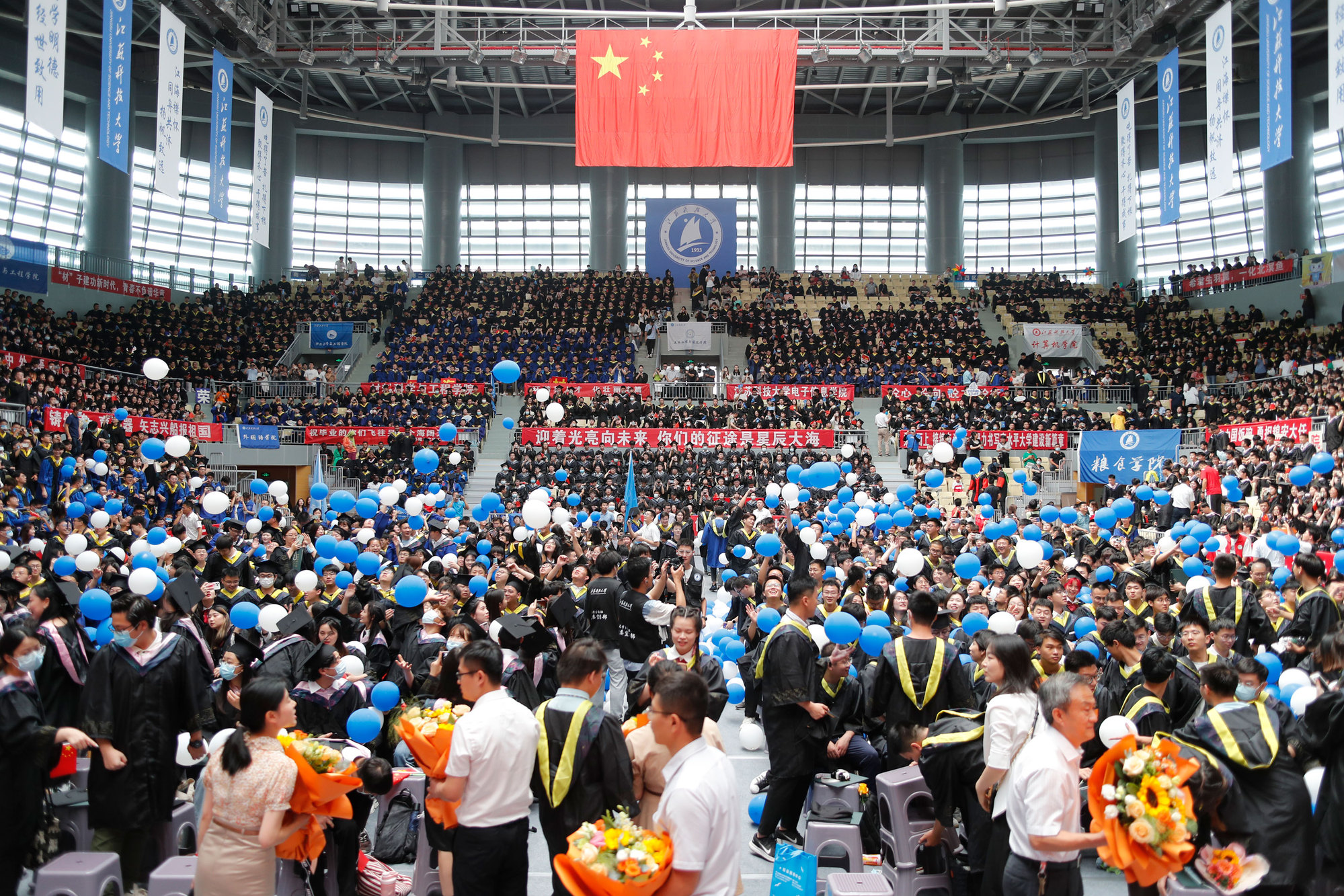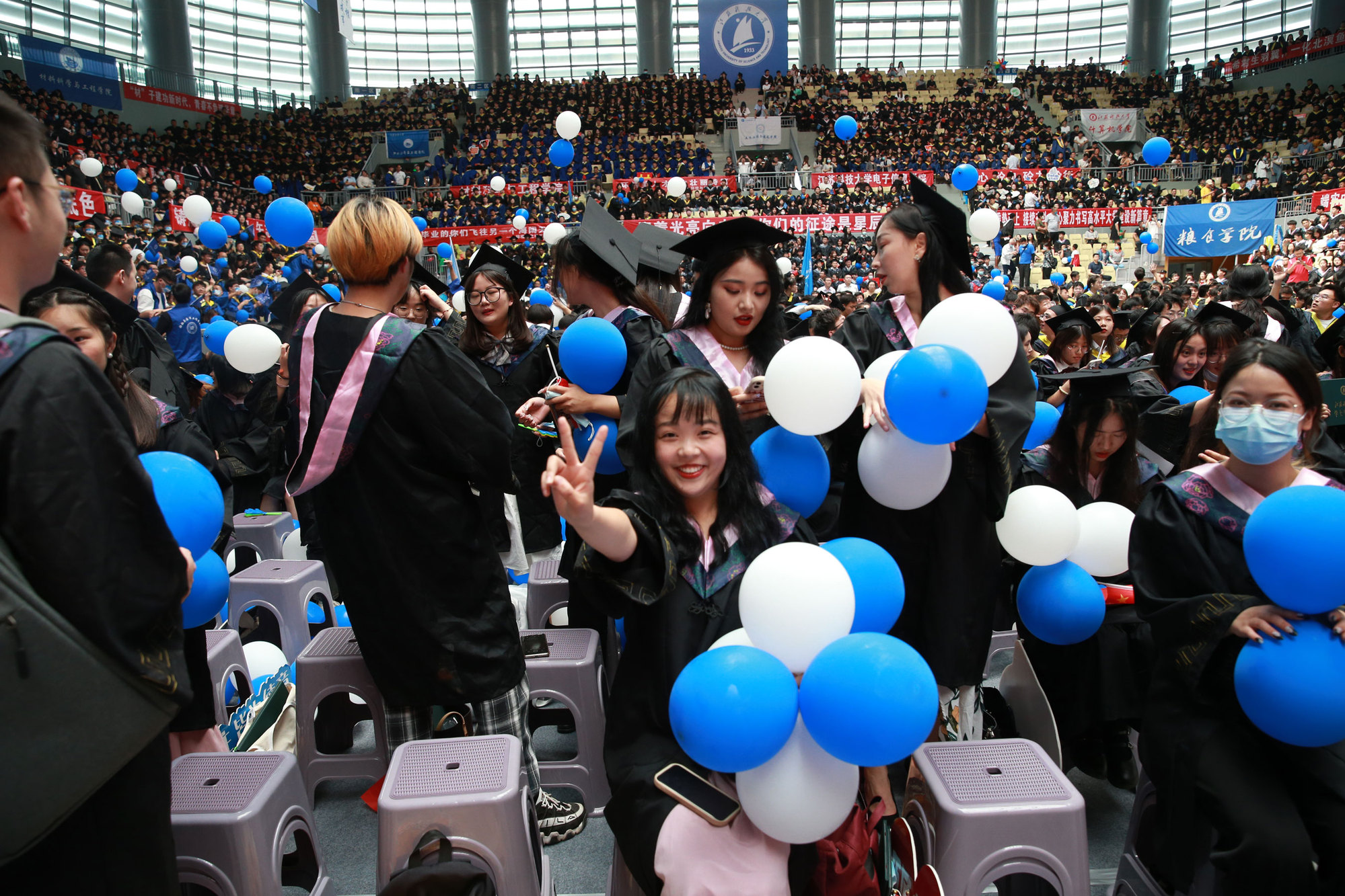 在910023威尼斯校歌声中,数千只蓝白相间的彩色气球从高空缓缓散落,仿佛跃腾的海浪,将现场氛围感拉满。伴着一路欢歌,庄重的学位授予仪式开始,毕业生依次上台领取学位证书,学位委员会全体导师为他们一一拨穗,圆满完成学位授予仪式。