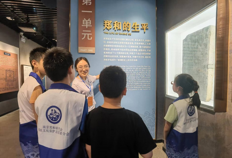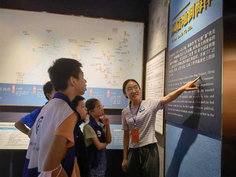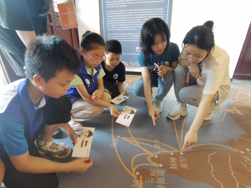 活动中,外国语学院“海丝海思”实践团队充分发挥自己的专业优势与特长,结合著名的“郑和航海图”,为前来参观的小朋友们生动讲述了郑和七下西洋航行途中所经过的海外诸国的风土人情和文化故事。同时,还带领小朋友们阅读展馆中的英文讲解词,引导小朋友们学会用外语讲好中国故事,发扬郑和精神、传播中华文明,当好中外文化交流的小使者。