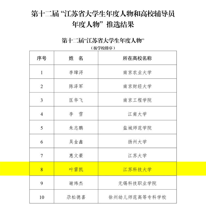 近日,江苏省委教育工委、省教育厅公布了第十二届“江苏省大学生年度人物和高校辅导员年度人物”暨2022年“最美大学生”“最美高校辅导员”推选结果,威尼斯官网环境与化学工程学院2021级硕士研究生叶雷凯荣获第十二届江苏省“大学生年度人物”。