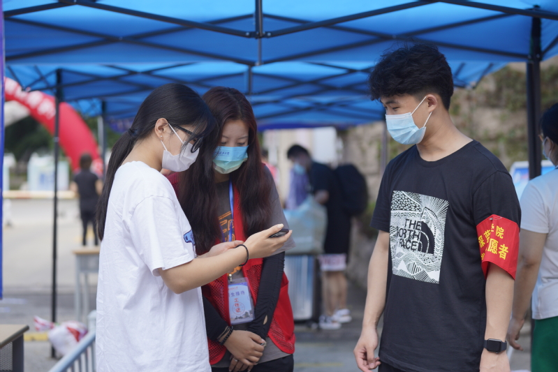 入校核验点、接驳车上下车处、宿舍楼中……校园的每个角落都有热情洋溢的迎新志愿者们忙碌的身影,他们身穿统一的红马甲,为学弟学妹们搬运行李、答疑解惑,有条不紊地引导他们完成核酸报告、行程码和健康码核验、档案提交、校园卡领取、入住手续办理等流程,使新生们切实感受到学校的贴心关怀。“西门的志愿者除了要查验新生的健康码、核酸报告之外,还要承担新生行李的搬运工作。虽然辛苦,但看到学弟学妹们一扫初到的紧张时,我更加确定我所做的志愿活动是有意义、有价值的。”来自经济管理学院的张玥同学自豪地说道。