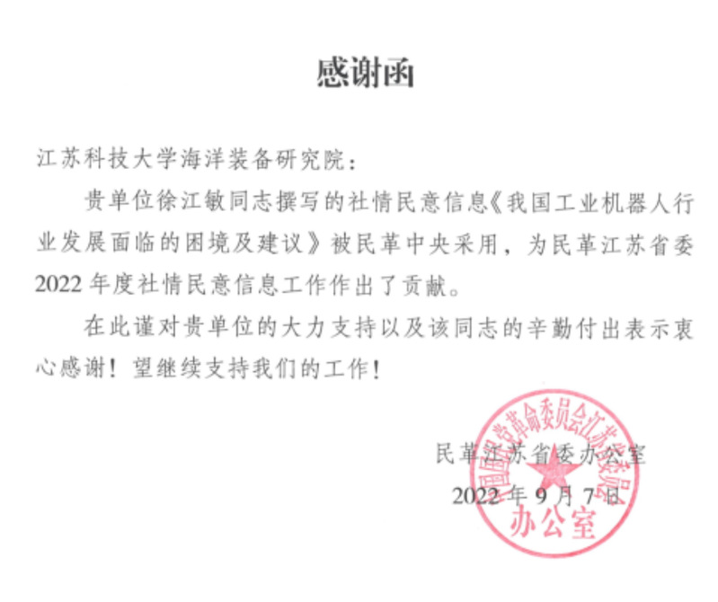 近日,民革江科大支部徐江敏撰写的《我国工业机器人行业发展的困境及建议》社情民意信息,被民革中央采用。