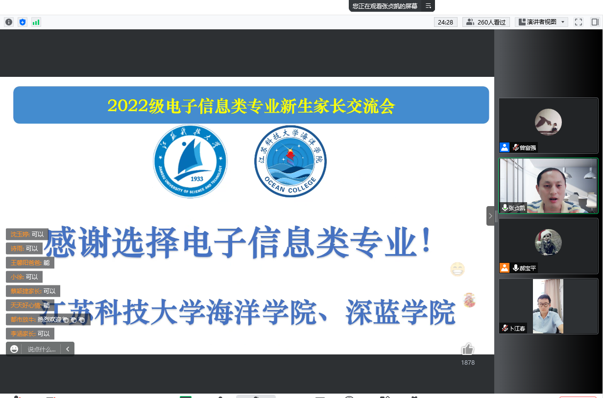 家长会前,各专业学院从自身实际出发,充分准备,个性化设计家长会流程。家长会上,各学院领导对新生家长的参会表示欢迎和感谢,并播放了学校宣传视频,详细介绍了学校的基本概况和办学特色。各学院分管教学的副院长分别从学院的办学历史、学科优势、师资力量、教学科研平台、人才培养特色等方面进行了重点介绍。各学院分管学生工作的副书记从学生管理、安全教育、奖助贷政策、创新创业、生涯规划等方面作详细介绍。各系部主任分别从培养计划、课程设置、培养目标等方面向家长进行了详细的专业解读。各新生辅导员就深蓝学院日常管理、学生培养等方面作了简单介绍。部分学院还邀请高年级优秀学生代表,从专业学习、学科竞赛、社会实践、考级考证、友情爱情等方面进行了分享。最后,各学院现场连线,就专业分流、专业发展、就业前景、保研考研等家长关心的问题进行了详细解答。