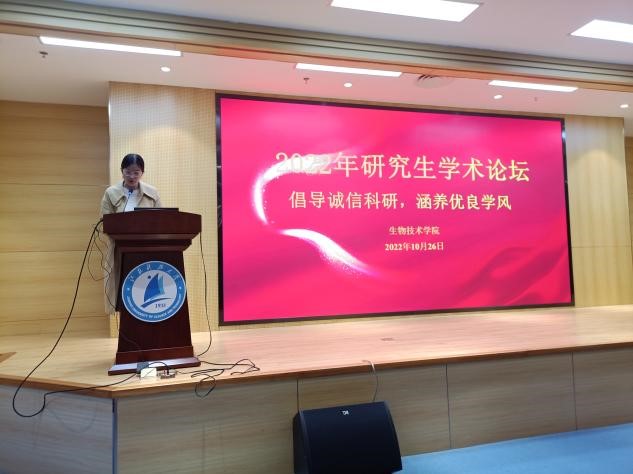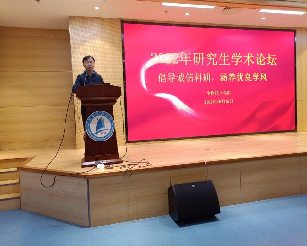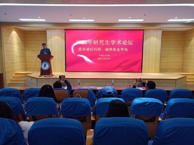 研究生学术活动是研究生培养过程中的重要环节,也是培养研究生科研创新能力的重要手段。为进一步倡导诚信科研,涵养优良学风,10月26日下午,生物技术学院在长山校区图书馆B102会议室举办2022年研究生学术论坛。校研究生院副院长、党委研究生工作部副部长梅岭、蚕业研究所副所长、生物技术学院副院长刘利、党委副书记钱平出席开幕式,参加论坛的还有生物技术学院研究生、博士生。