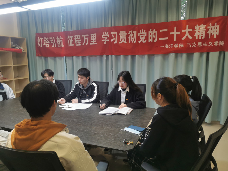 海洋学院的学生们分享学习感悟,纷纷表示要联系实际认真学好党的二十大报告,将党的二十大精神贯穿学习工作的全过程各方面。学生代表吕付帅表示:“作为新时代的大学生,生逢其时,施展才干的舞台无比广阔,实现梦想的前景无比光明。一定坚定不移听党话、跟党走,用党的科学理论武装头脑,为实现海洋强国战略贡献青春力量。”