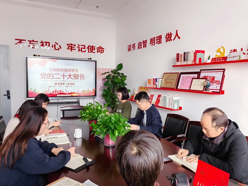 图书馆各支部书记围绕党的二十大报告讲党课,第一支部支部书记李新英围绕党的二十大报告总结了23个关键词,并进行了深入解读;第二支部支部书记吴亚艳结合党的二十大报告中有关教育问题的最新论述,给支部全体教职工上党课《服务育人担使命,守正创新开新局》。