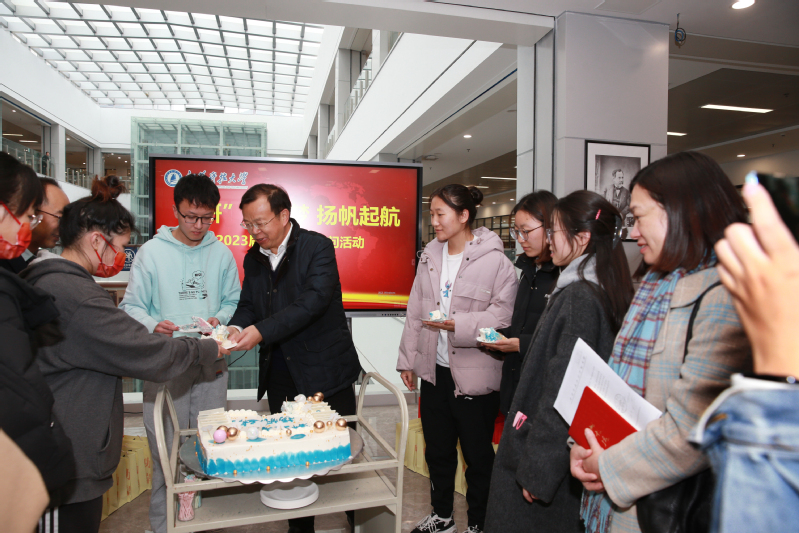 活动现场,周南平与考生代表共许愿,切分蛋糕。随后,与会领导一同向考生送上学校精心准备的“考研暖心包”,其中包含考研“旺旺”——旺仔牛奶、“士力架”倍——巧克力、“牛”气冲天——牛角包、“橙”功上岸——橙子、“暖”意洋洋——暖宝宝、“罩”气蓬勃——口罩,每一份礼品都饱含着学校对考研学子的深深祝福和殷切关怀。