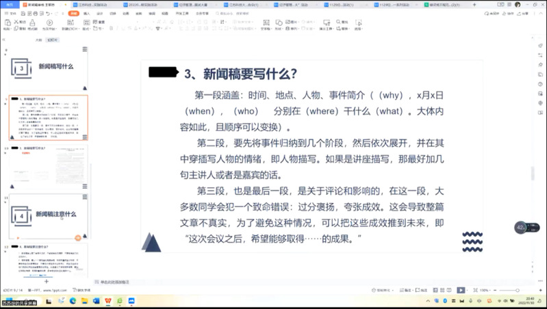 本期主要内容为新闻稿的撰写与审核,由经管学院的王鄂苏和自动化学院的陈祉瑜主讲。分别从近期案例解析、新闻的基本知识、新闻的特点、新闻写作中的常见问题为大家带来细致讲解。