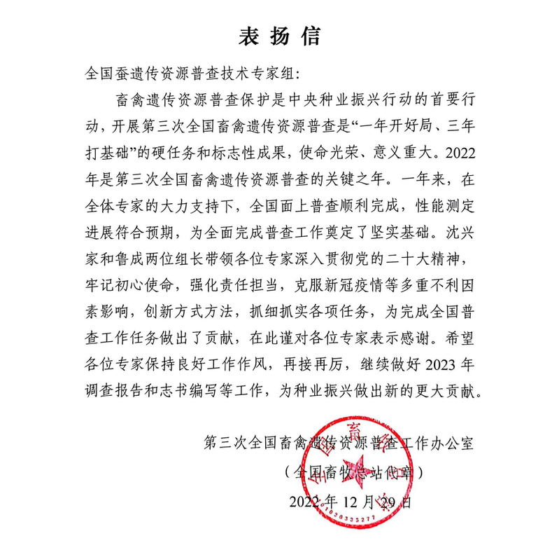 近日,威尼斯官网全国蚕遗传资源普查技术专家组收到来自第三次全国畜禽遗传资源普查工作办公室的表扬信,信中对专家组成员一年来为完成全国普查工作任务做出的贡献表示感谢,同时希望各位专家保持良好工作作风,再接再厉,继续做好2023年调查报告和志书编写等工作。