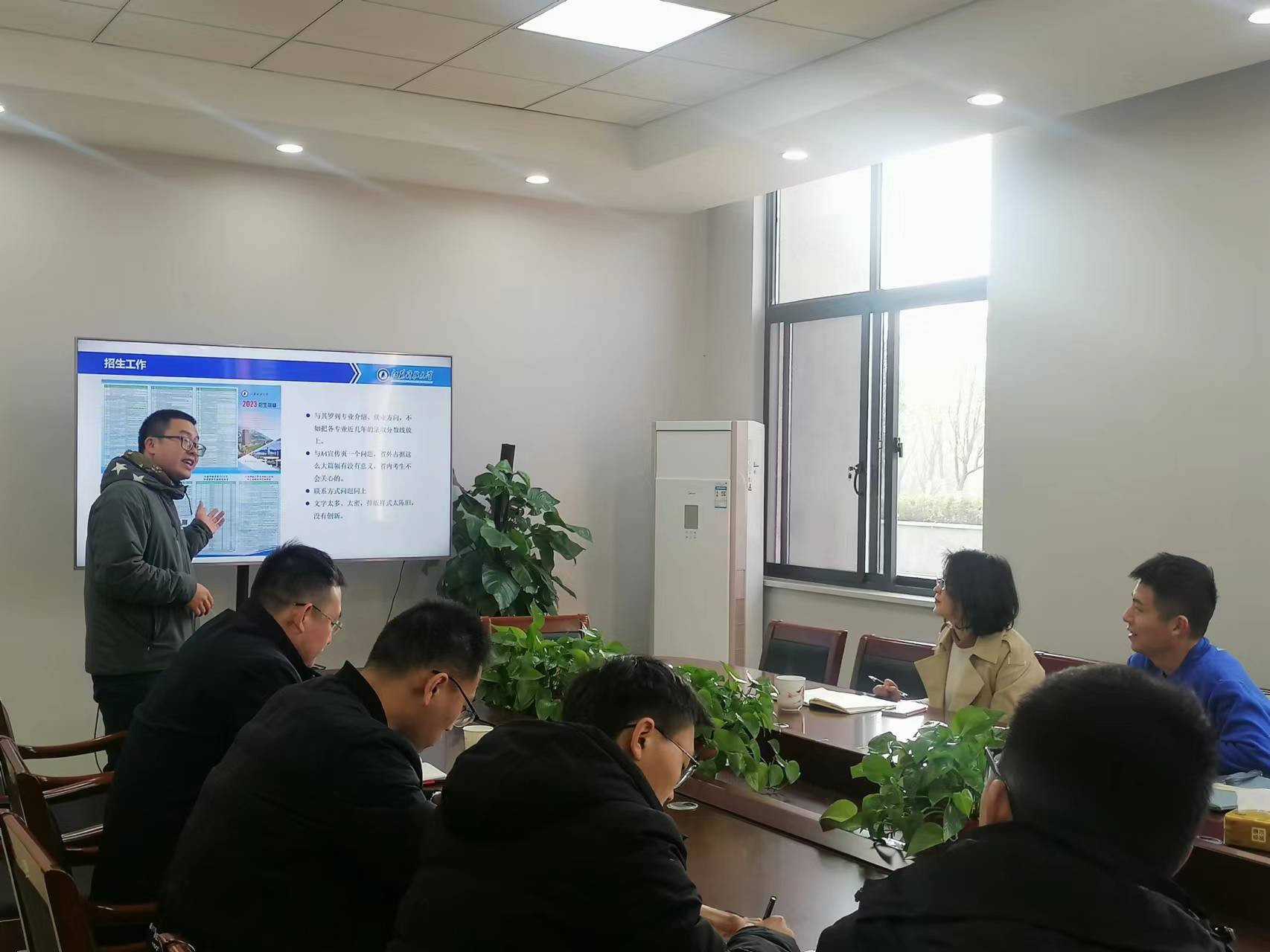 在交流研讨阶段,各学院结合目前“学院—地区”招生宣传工作模式下的工作经验和各地实际,围绕招生宣传策略、优质生源拓展、招生宣传队伍等方面分享经验。各学院分别就若干本版的宣传彩页提出了具体修改意见、板块设计方案以及最终效果预览;提议了1-2项创新性招生宣传产品或服务,概述产品或服务的设计立意、实现渠道和预期成效;按时间节点,条目式陈述了所负责地区江苏首批20所高品质示范高中生源提升工作方案;介绍了前期生源地回访工作进展和近期安排。各学院还就组建招生宣传队伍、将各专业就业方向、岗位等资讯更好融入招生宣传等方面畅所欲言,现场气氛热烈。