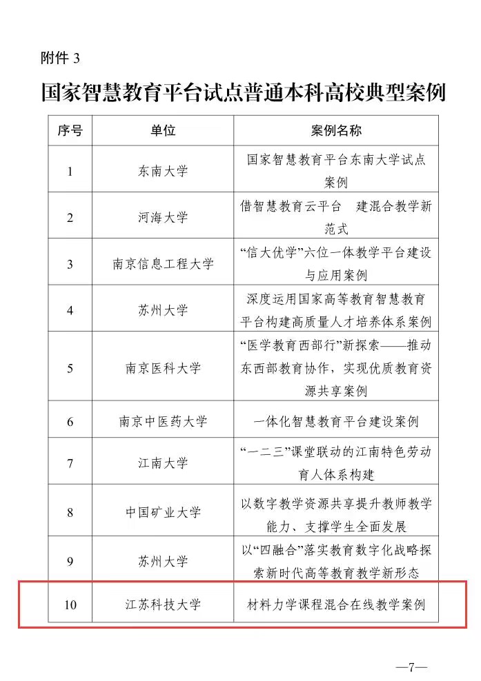 近日,江苏省教育厅公布了《省教育厅办公室关于推广国家智慧教育平台试点工作典型案例的通知》(苏教办信函〔2023〕6 号),遴选了体现江苏特色、有创新、可复制的43个典型案例,其中,试点普通高校典型案例10个。威尼斯官网组织申报的《材料力学课程混合在线教学案例》成功入选试点普通高校典型案例。