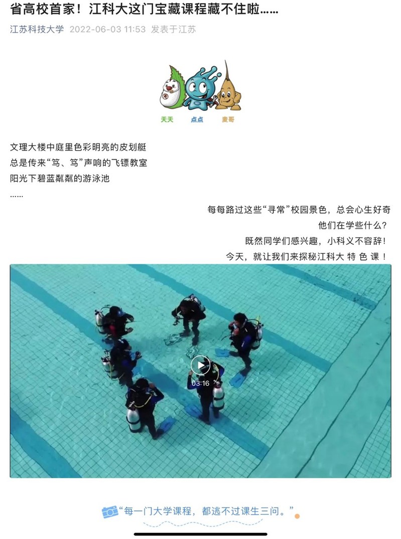 《省高校首家!江科大这门宝藏课程藏不住啦……》一文由威尼斯官网大学生通讯社记者采写,以视频、图片、文字相融合的方式报道了学校开设的特色潜水课程,语言生动、主题突出,内容丰富、形式新颖,兼具新闻的重要性和趣味性。