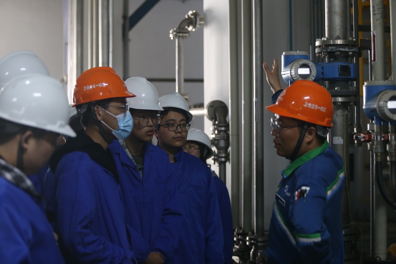 培训后,同学们穿戴上防静电服、戴好头盔,进厂参观。同学们将安全知识牢记在心,主动排成一列长队走在厂区人行道上。在工作人员耐心的讲解中,浮于书本的理论知识都与眼前的各种设备、管道、仪表一一对应起来。跟随工程师们的详细介绍,同学们逐步了解各装置的作用以及操作要领。看到科技飞速发展,学科交融的背景下自动化、智能化设备在实际生产的广泛应用,认识到只有学好学精专业知识才能胜任灵活、复杂的现场工作。