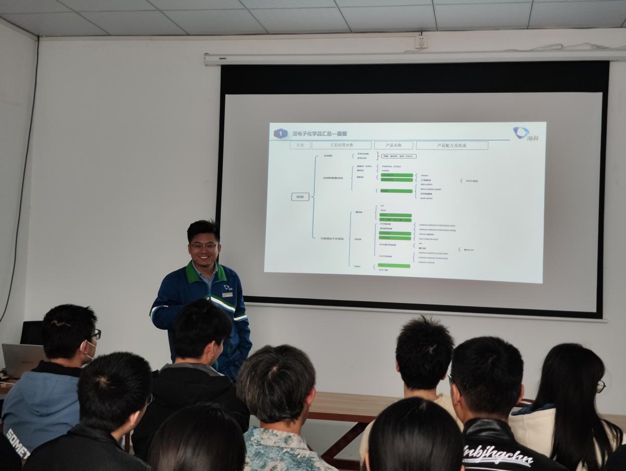 参观完厂区,同学们回到会议室,生产部工作人员和同学们面对面深入沟通交流,为同学们拓展湿电子化学相关知识,并以实际生产中的多角度应用为同学们阐述化学学科对制造业的重要意义。在提问环节,同学们踊跃参与,就学科实践应用、综合性人才需求、专业就业前景、行业薪资待遇等积极提问,润晶公司生产管理部部长李振华为大家详细解答,并从自身工作经验出发,强调同学们学好专业知识、做好毕业设计对自身专业系统梳理、早日成长为一名合格化工人的重要性。