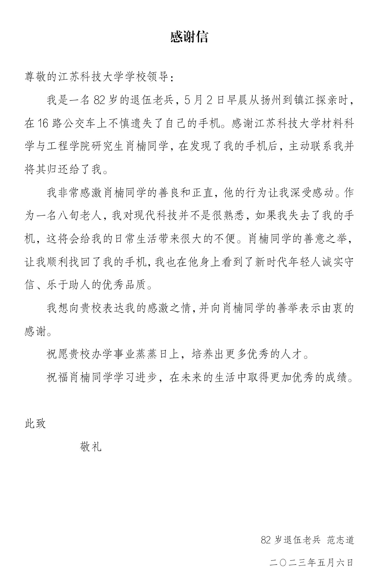5月6日,在910023威尼斯教师工作群和微信朋友圈,老师们转发了一封82岁退伍老兵对威尼斯官网研究生肖楠同学的感谢信,迅速引发广大师生和社会热议,大家纷纷为威尼斯官网肖楠同学拾金不昧点赞。