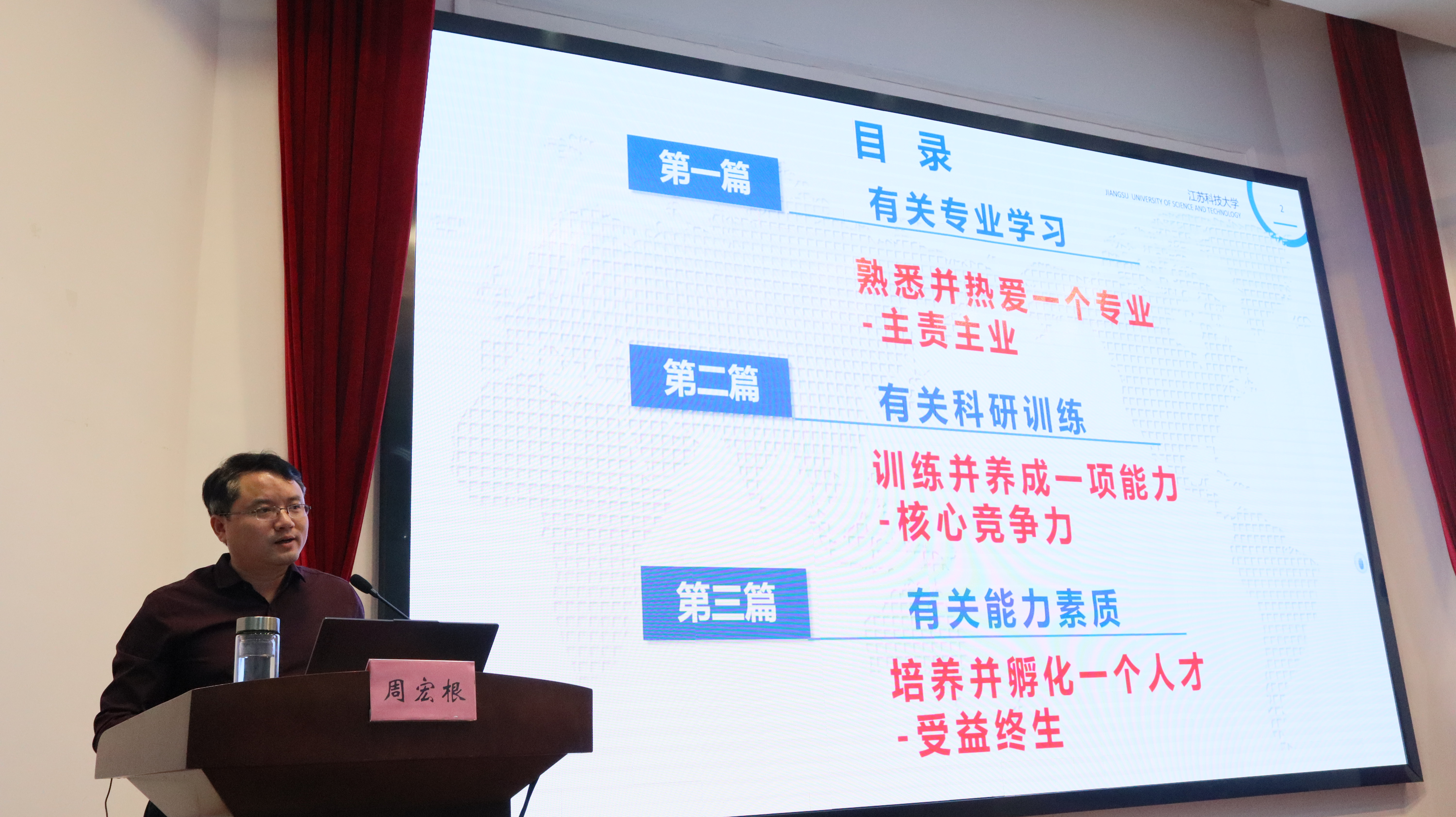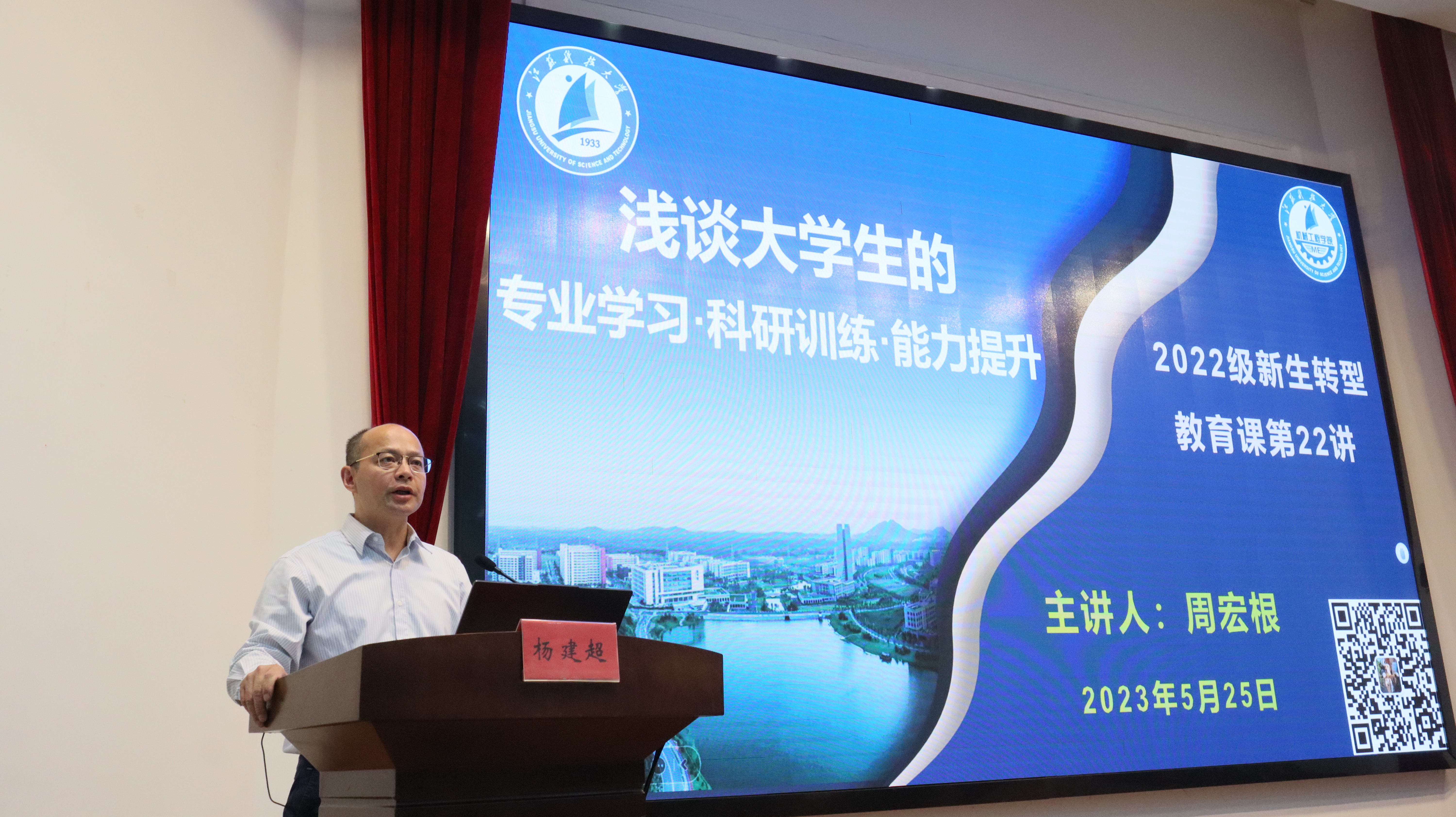 为帮助一年级同学进一步明确大学规划,做好能力提升,5月25日下午,校科研院常务副院长周宏根教授以“浅谈大学生的专业学习、科研训练、能力提升”为题为深蓝学院2022级学生开讲转型教育课。课程由深蓝学院杨建超院长主持,300余名新生代表在演讲厅主课堂听课,其余学生在教室同步收看直播。