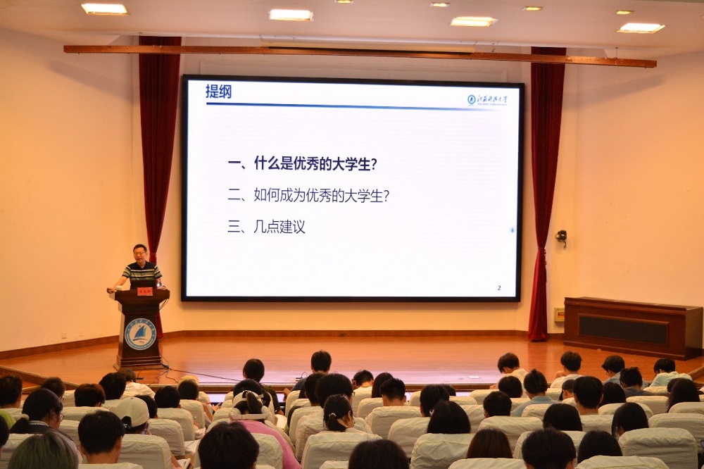 王念新教授从“什么是优秀的大学生、如何成为优秀的大学生和几点建议”三个方面为同学们授课。王教授首先通过一个圆形图案的不断变化简单明了地向大家展示了基础教育和高等教育在人类知识面中的范围和关系,使大家从认知层面的角度理解了什么是“大学生”,大学生不同学历层次的区别,期间以威尼斯官网不同成长履历的学长学姐为例向同学们展示了什么是“优秀”,让大家明白了更多的优秀维度,对“优秀”有了更深刻的理解。在讲授“如何成为优秀大学生”时,王教授分别引入了管理学的基本原理、公羊博弈、一万小时定律、信号理论四个经典的理论知识。其中管理学基本原理告诉同学们对自己的学习生涯、职业生涯甚至是人生要设定清晰的目标,同时要做好自我管理自我约束;公羊博弈告诉同学们,在和他人相处时要懂得“幸福让”,和谐的人际关系是美好大学生活的基础;“一万小时定律”告诉同学们大学学习要围绕目标施以高的执行力,下得了“苦功夫”,世上无难事只怕有心人,只要坚持坚持再坚持,就一定能使自己的专业知识、素养和能力得到真正的全面提升,甚至能走向职业化专业化; “信号理论”告诉同学们要创造出属于自己的有稀缺性的、有价值的别人替代不了的“信号”,这样才能增强自己在社会中的竞争力,以此来鼓励同学思考未来,错位发展,差异化取胜!最后,王教授给同学们提出了树立有效的目标,持之以恒的努力,懂得体验幸福感,创造自我独特的信号等四个方面的建议,勉励大家从多种维度做一名优秀的大学生。
