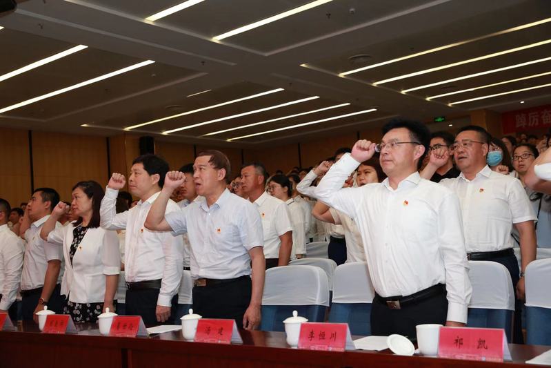 校党委副书记汤建带领全体党员重温入党誓词。党员同志面向党旗庄严宣誓,在铮铮誓言中重温入党初心,坚定理想信念,牢记责任。