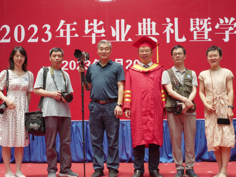 典礼结束,周南平校长与摄影团队成员合影留念,并与成员一一握手说道,你们辛苦了,谢谢大家!周校长对拍摄工作给予肯定。