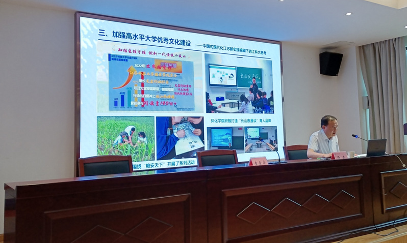 党委副书记汤建以《深刻领会中国式现代化内涵,加强高水平大学优秀文化建设》为题,深入阐释“中国式现代化”的内涵及重大意义,并以习近平总书记对江苏现代化建设的要求和嘱托为指引,系统阐述了全面推进中国式现代化的江苏新实践。他指出,强国必先强教,中国式现代化需要教育现代化的支撑。江苏是经济大省、教育大省,江苏的教育现代化建设在全国“一盘棋”中具有重要典型意义。汤建聚焦江科大高水平大学优秀文化建设,从学校特色鲜明的育人传统、育人工作存在的不足、“兴船报国”文化育人的实践探索及其形成的特色育人成果等方面详细阐述了中国式现代化江苏新实践视阈下的江科大思考。他表示,学校将持续开展“船魂”精神传承创新工程;启动校史文脉传承工程;持续推进深蓝课程群建设;深入打造船海特色的科技文化系列活动。