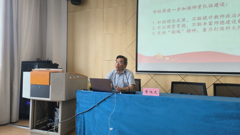 党委副书记、副校长景旭文以《以中国式现代化全面推进中华民族伟大复兴》为题,从中国关于工业化的历史话语权的形成谈起,围绕“中国式现代化的科学内涵和重大意义”“以高等教育强国建设助力中国式现代化”“加强师资队伍建设推动学校高质量发展”三个方面展开阐述。他强调,做好高校教师的思想政治教育,加强师德师风和意识形态工作,对于加强党对高校的领导,全面贯彻党的教育方针,坚持社会主义办学方向,培养德智体美劳全面发展、堪当民族复兴大任的社会主义建设者和接班人具有重大而深远的意义。他表示,学校将进一步加强师资队伍建设,加强理论武装,不断提升教师政治站位;突出课堂育德,不断丰富师德建设载体;发扬“船魂”精神,着力打造江科大师德品牌。