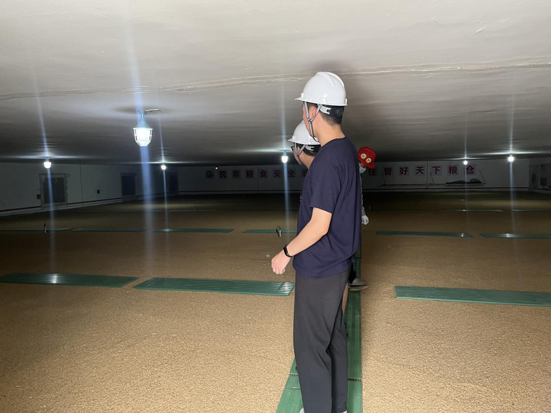 随后,实践团成员们走进粮仓,在工作人员的指导下学习如何用机器取样。根据一个仓库的储存量来决定抽取点位的数量,储存量越多,点位也越多。实践团成员们还学习了虫情检测系统,此系统通过诱导剂吸引粮仓里的虫子,通过机器统计虫子的数量,并通过云端发送给主机。当虫子多达一定数量时,开始熏蒸杀虫。在粮堆测温学习时,成员们在工作人员指导下学习运用可移动测温器进行手动测温,了解粮堆出现的异常发热、发热原因与处理方法,学习单管风机降温原理,并实际操作插单管进行处理发热粮堆。这些实践不仅加深了同学们对仓储管理的认识,也提高了同学们的实践能力、增强了同学们对粮食工程知识的掌握,使大家对粮食从业者的工作责任有了更全面的了解。