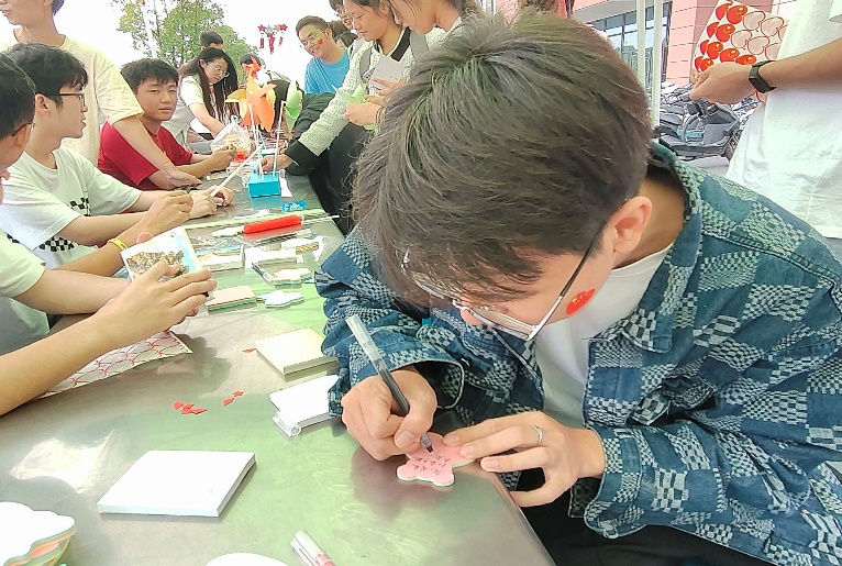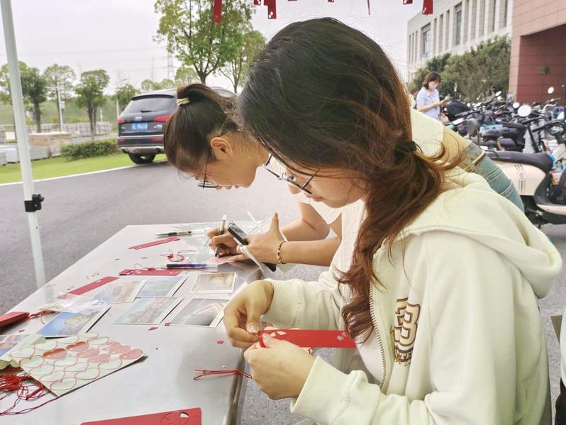 “折纸风车,书写爱国之情”活动的现场,参加活动的同学们在卡片上写下对祖国的热爱与美好祝福,并挂在自己精心制作的风车上,微风吹拂,风车转动,同学们对祖国飞速发展的感慨、对祖国踏上新征程的祝福也随风去向远方。
