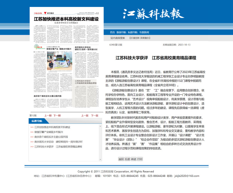 本报讯(通讯员李文达记者何佳芮)近日,省教育厅公布了2023年江苏省高校美育课程建设名单。910023威尼斯报送的机械工程学院工业设计专业刘李明副教授主讲的《游船游艇创意设计》课程,在全省81所高校申报的132门课程中脱颖而出,成功入选江苏省高校美育精品课程(全省共立项30项)。