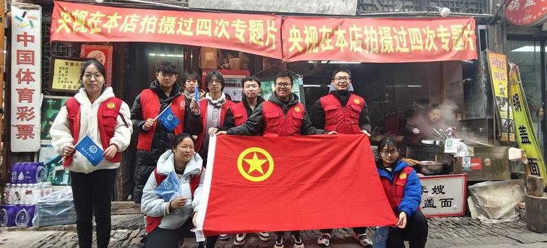 图为团委同学们在李嫂锅盖面店铺门前合照